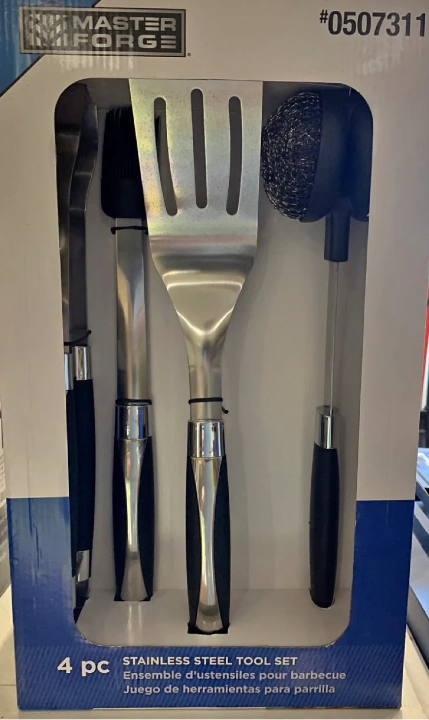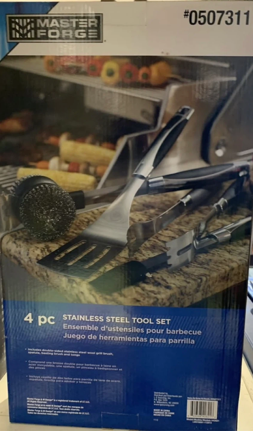 Selling a brand new, still-in-box Master Forge 4-piece stainless steel BBQ tool set! This set includes a spatula, grill brush, fork, and tongs, perfect for all your grilling needs. The tools are made of durable stainless steel, ensuring they'll last for many barbecues to come. Great for summer cookouts!