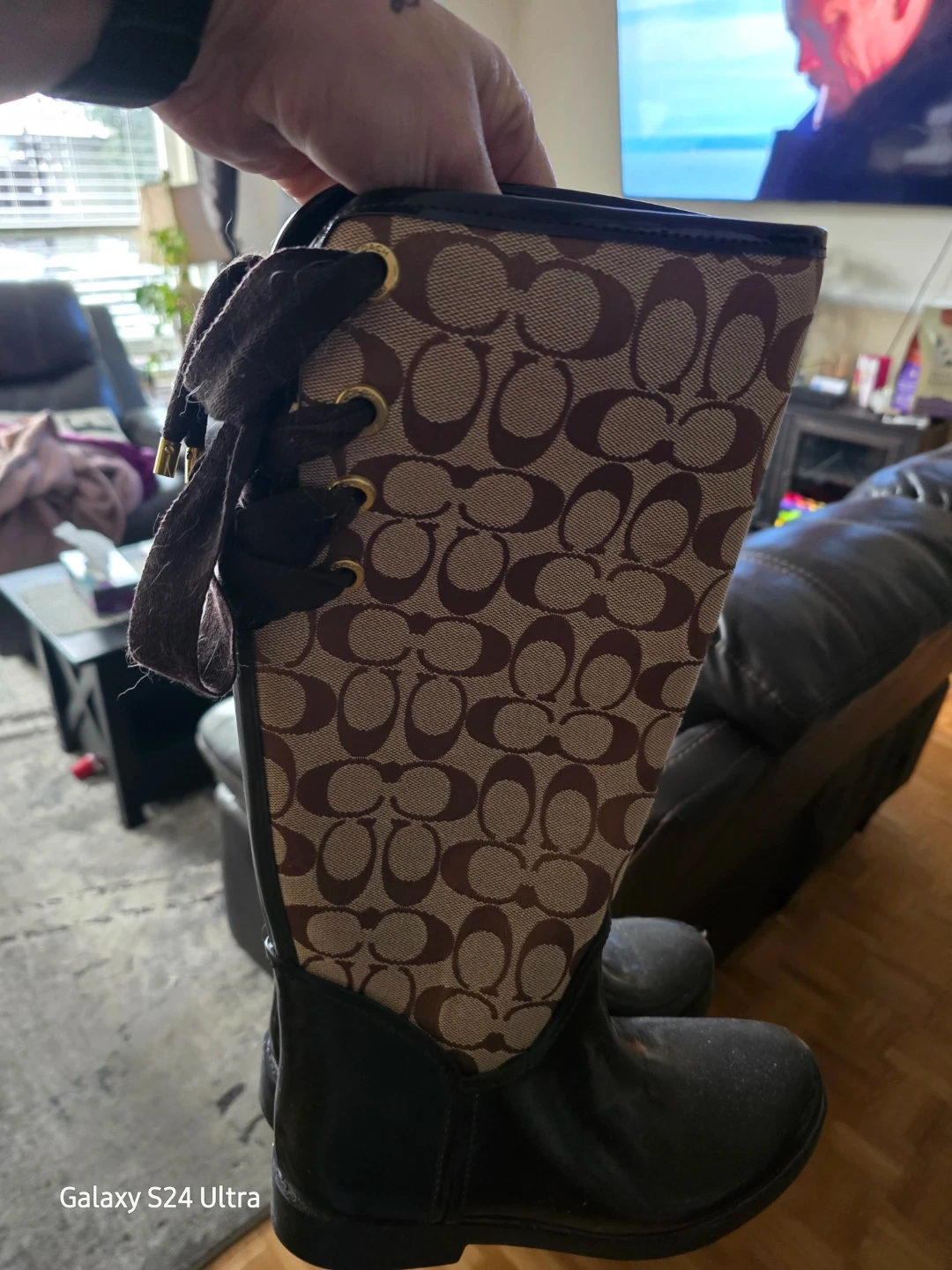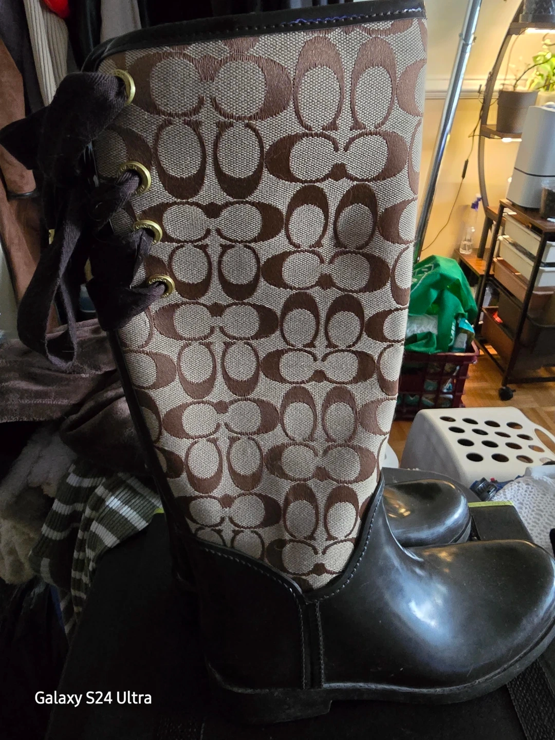 Selling a pair of Coach rain boots in a size 8. They feature the classic Coach pattern on the upper part of the boot. The soles have some wear, but overall they're in good condition and ready to keep your feet dry!