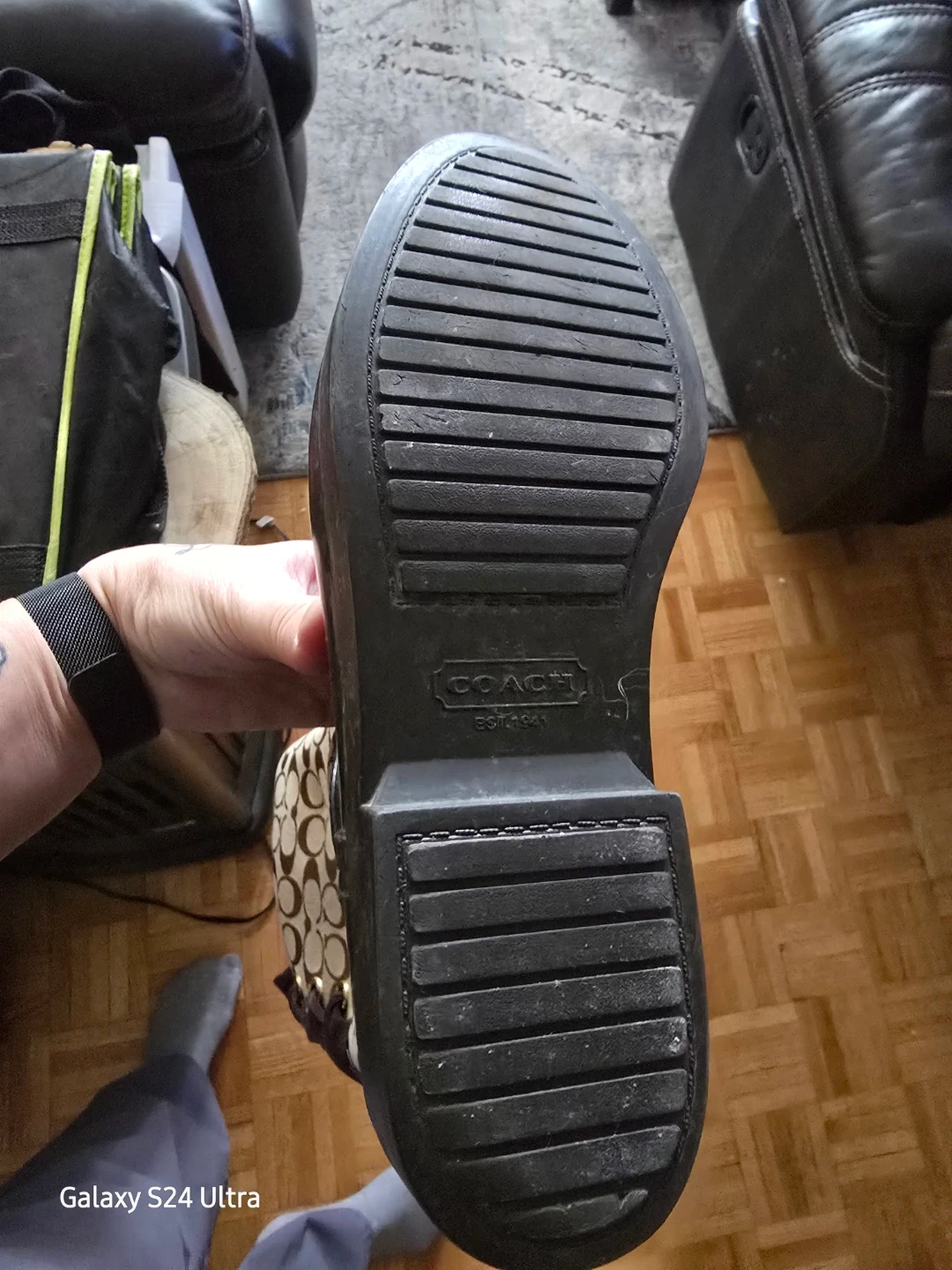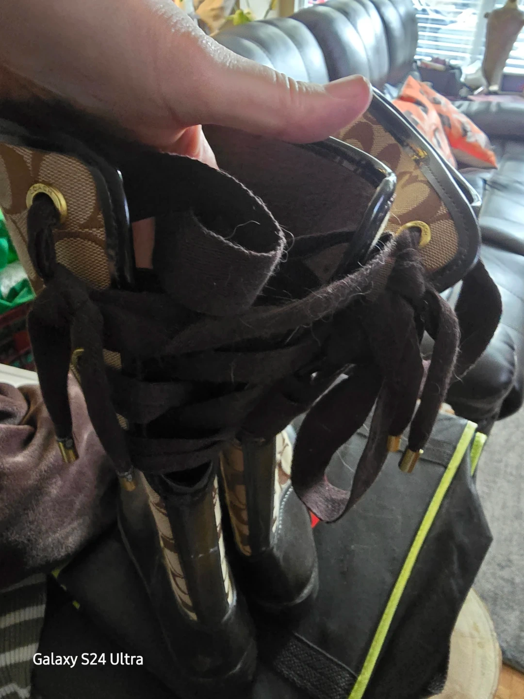 Selling a pair of Coach rain boots in a size 8. They feature the classic Coach pattern on the upper part of the boot. The soles have some wear, but overall they're in good condition and ready to keep your feet dry!