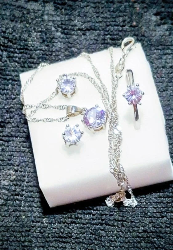 Here's a beautiful GRA jewelry set, including a necklace, earrings, and a ring. It comes with a Limited Lifetime Warranty and Certificate of Authentic.
