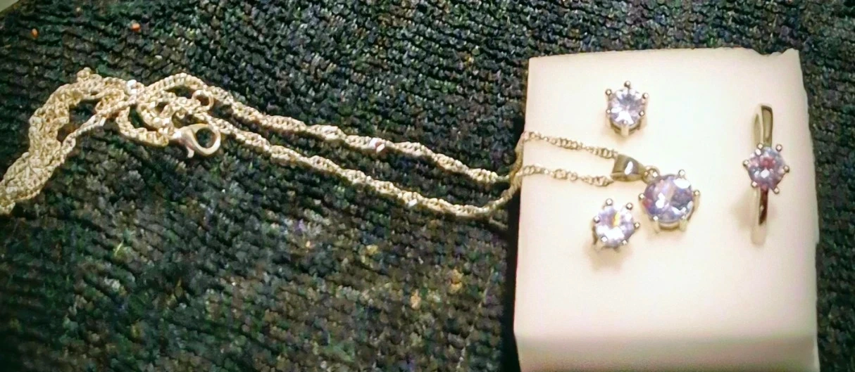 Here's a beautiful GRA jewelry set, including a necklace, earrings, and a ring. It comes with a Limited Lifetime Warranty and Certificate of Authentic.