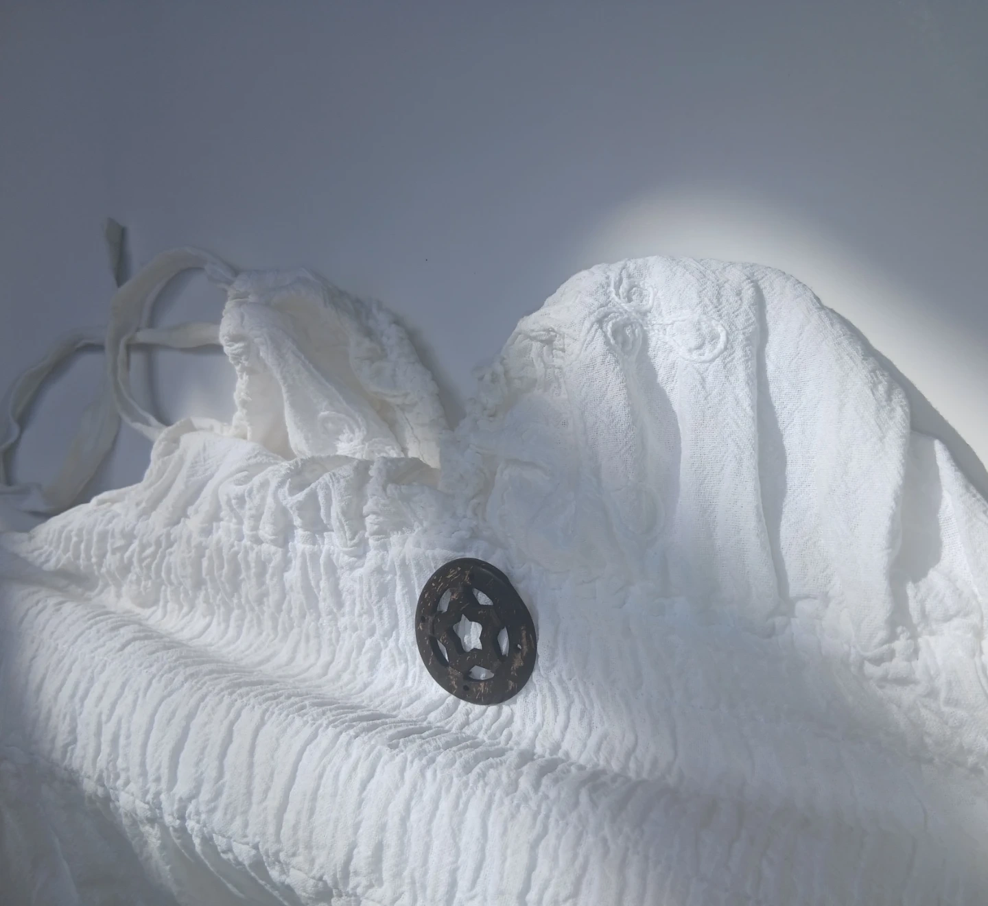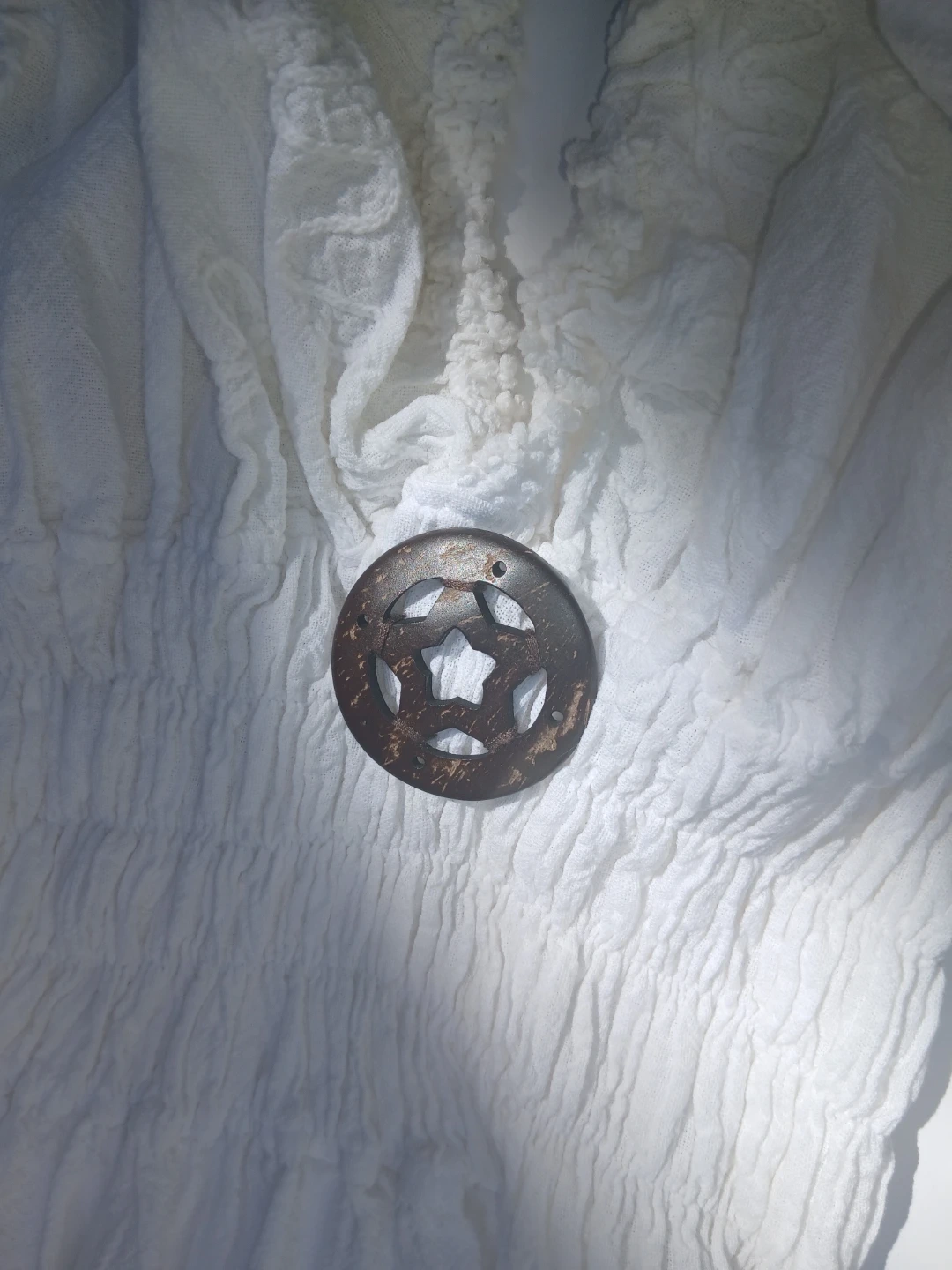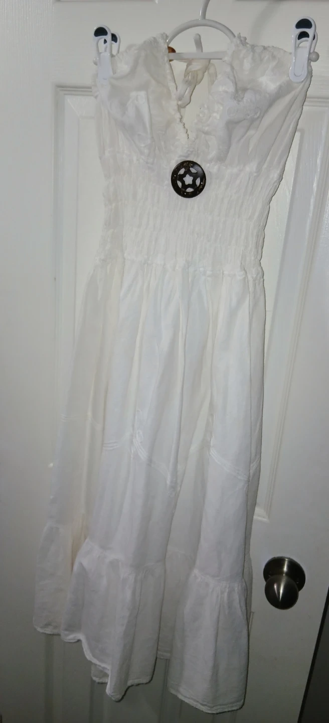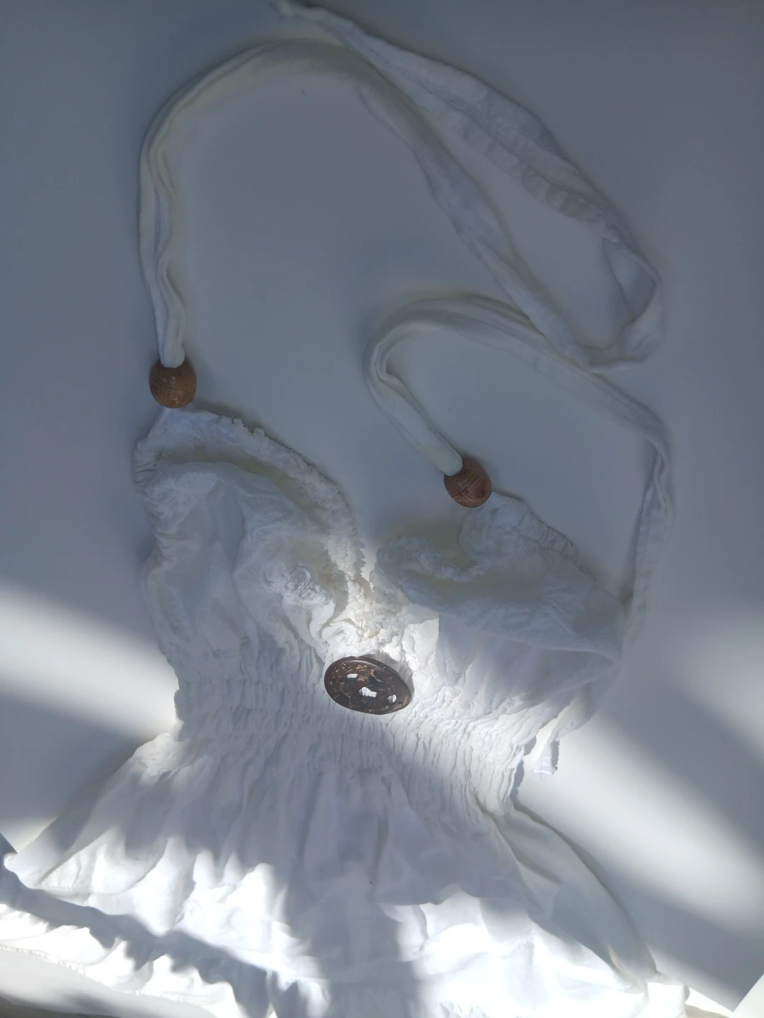 Selling a cute white sundress! It features a shirred bodice and a wooden accent piece.