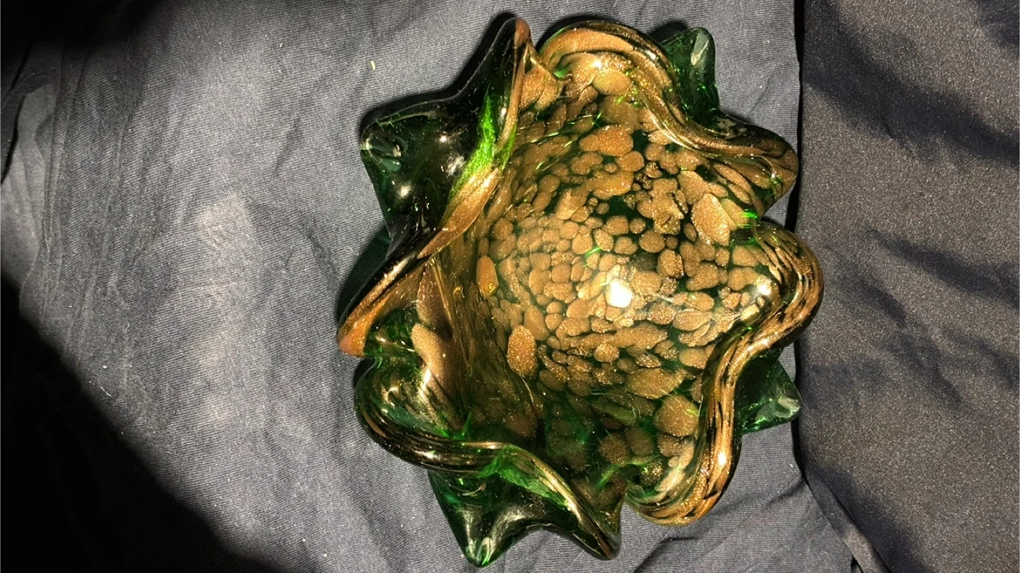 Selling a beautiful Murano art glass bowl. It features a unique green and gold design that would look great in any home. The bowl is in excellent condition and ready to be displayed!