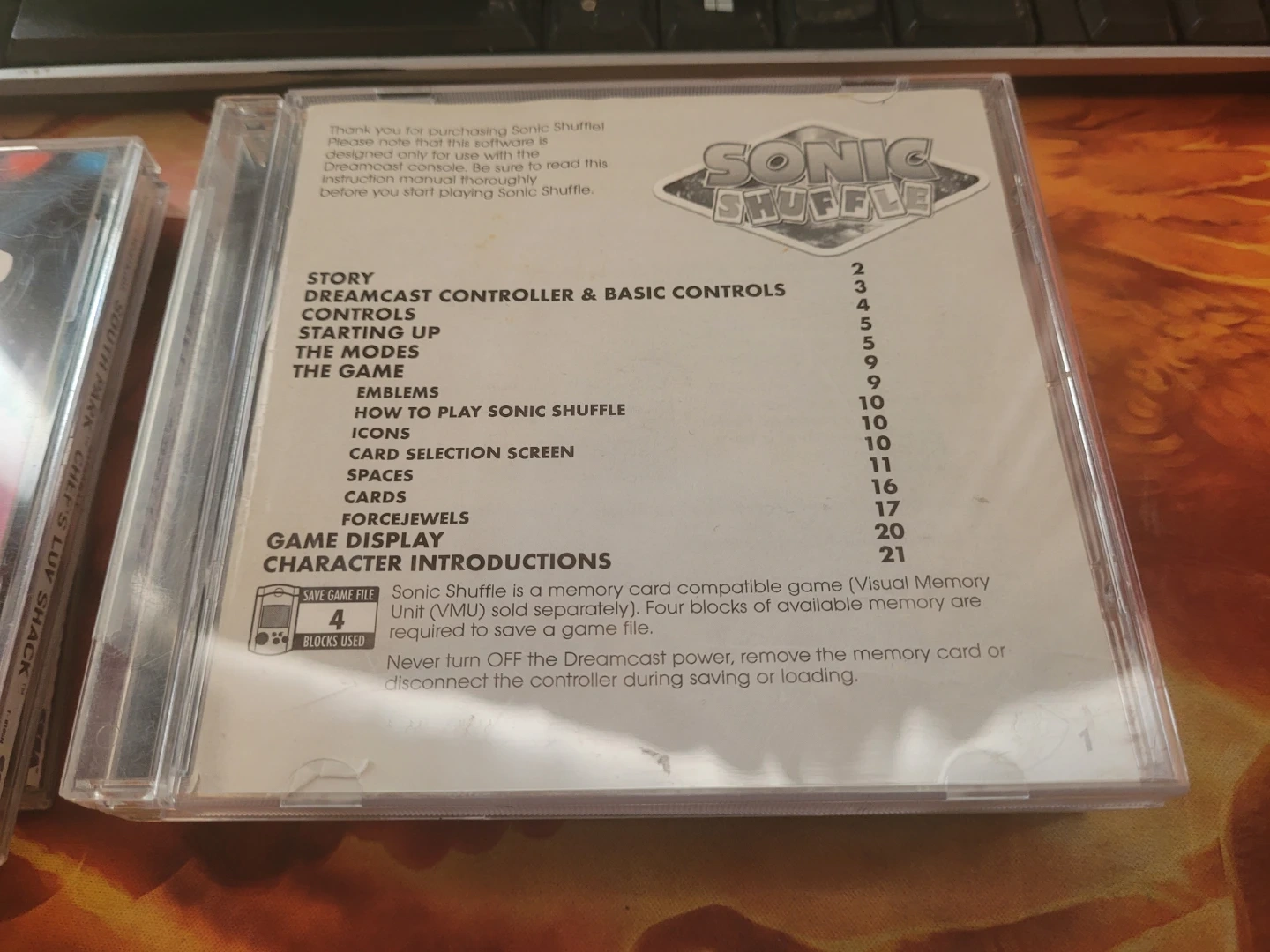 Selling Sonic Shuffle for the Dreamcast! This game is a memory card compatible game (Visual Memory Unit (VMU) sold separately). Four blocks of available memory are required to save a game file