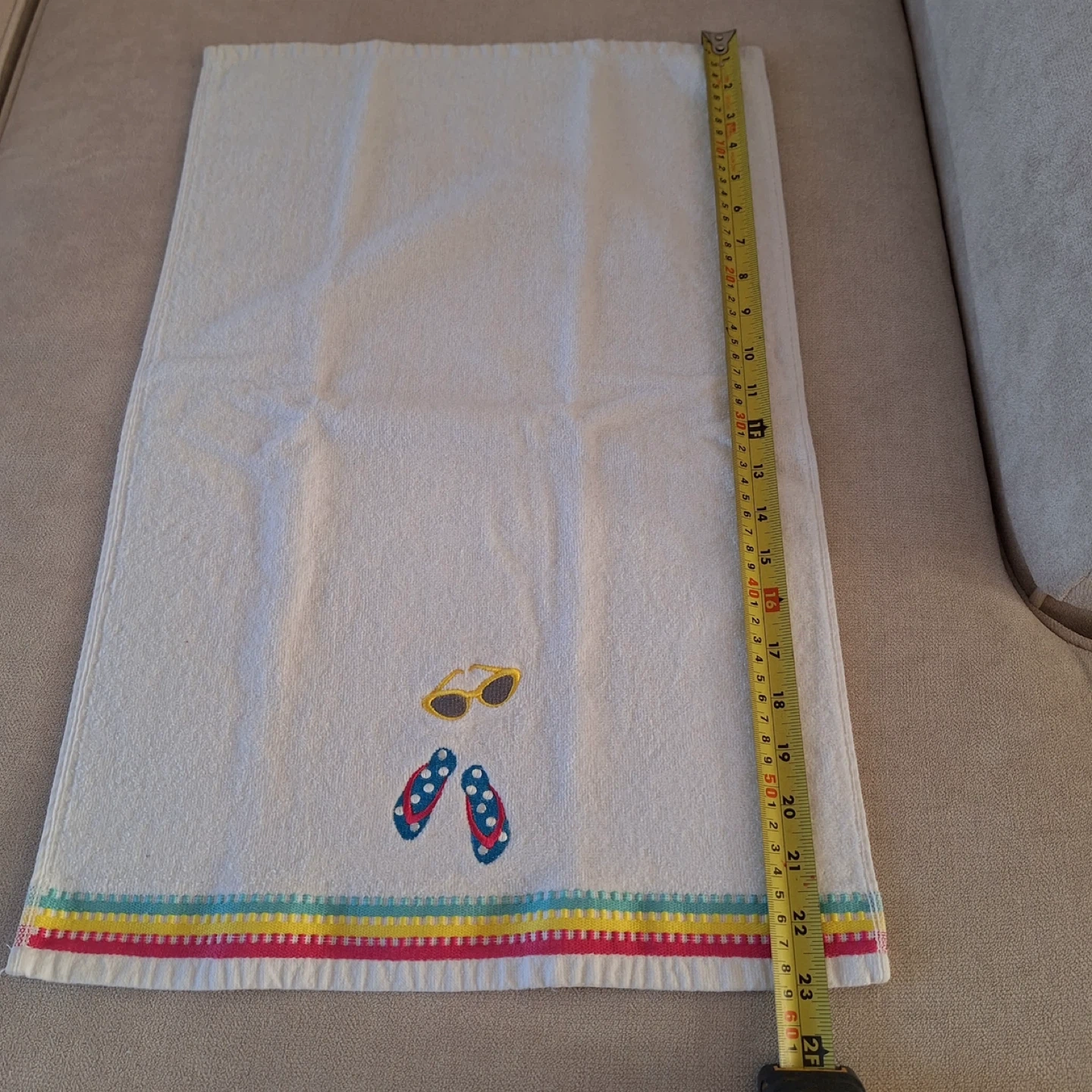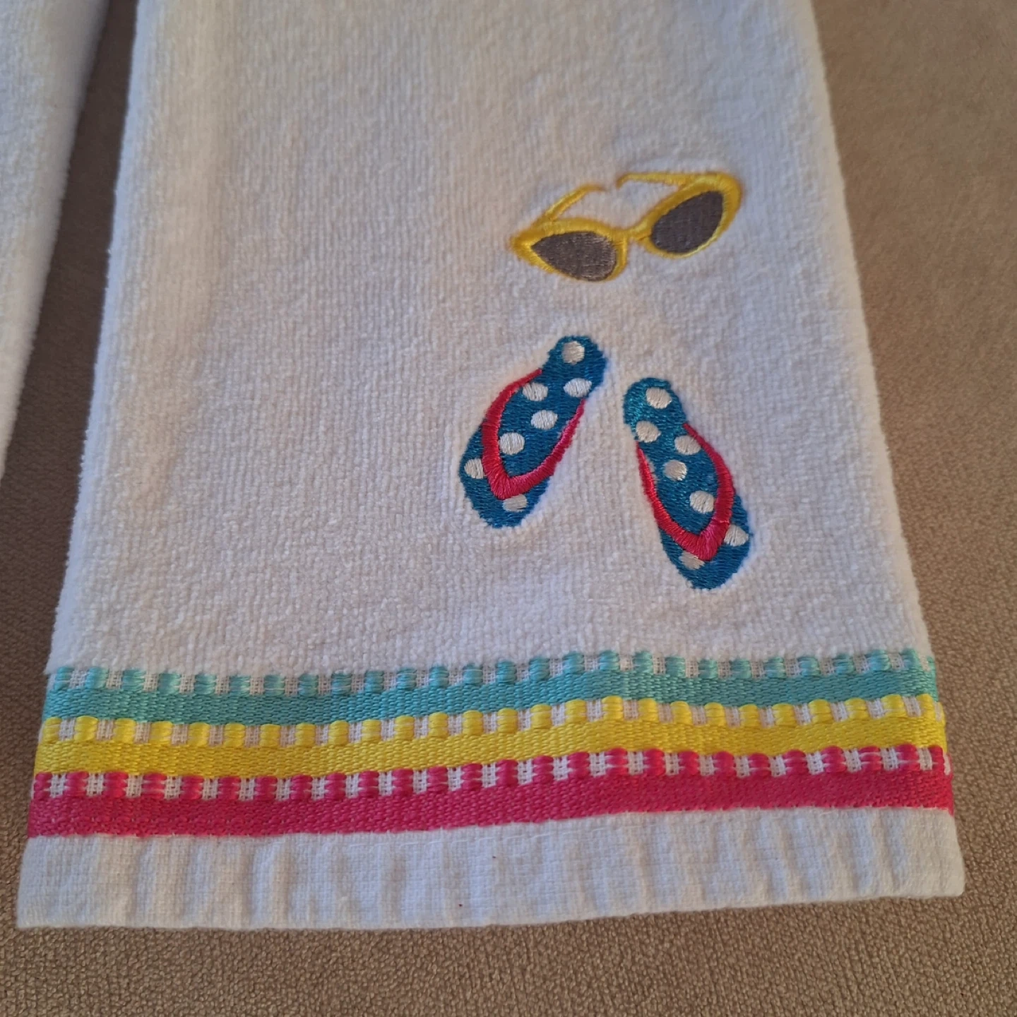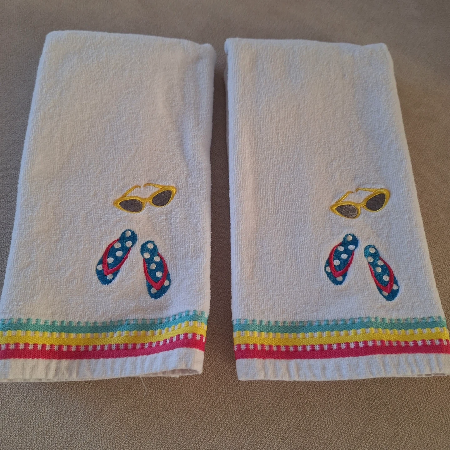 Here's a set of two SKL Home hand towels, perfect for adding a touch of summer to your bathroom or kitchen! 15x 23.They feature a cute embroidered design with sunglasses and flip-flops, plus a colourful striped border. They are made of 100% cotton.