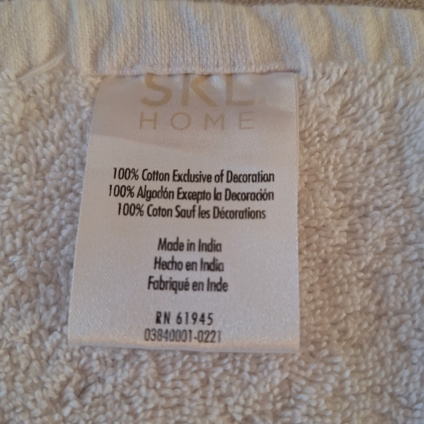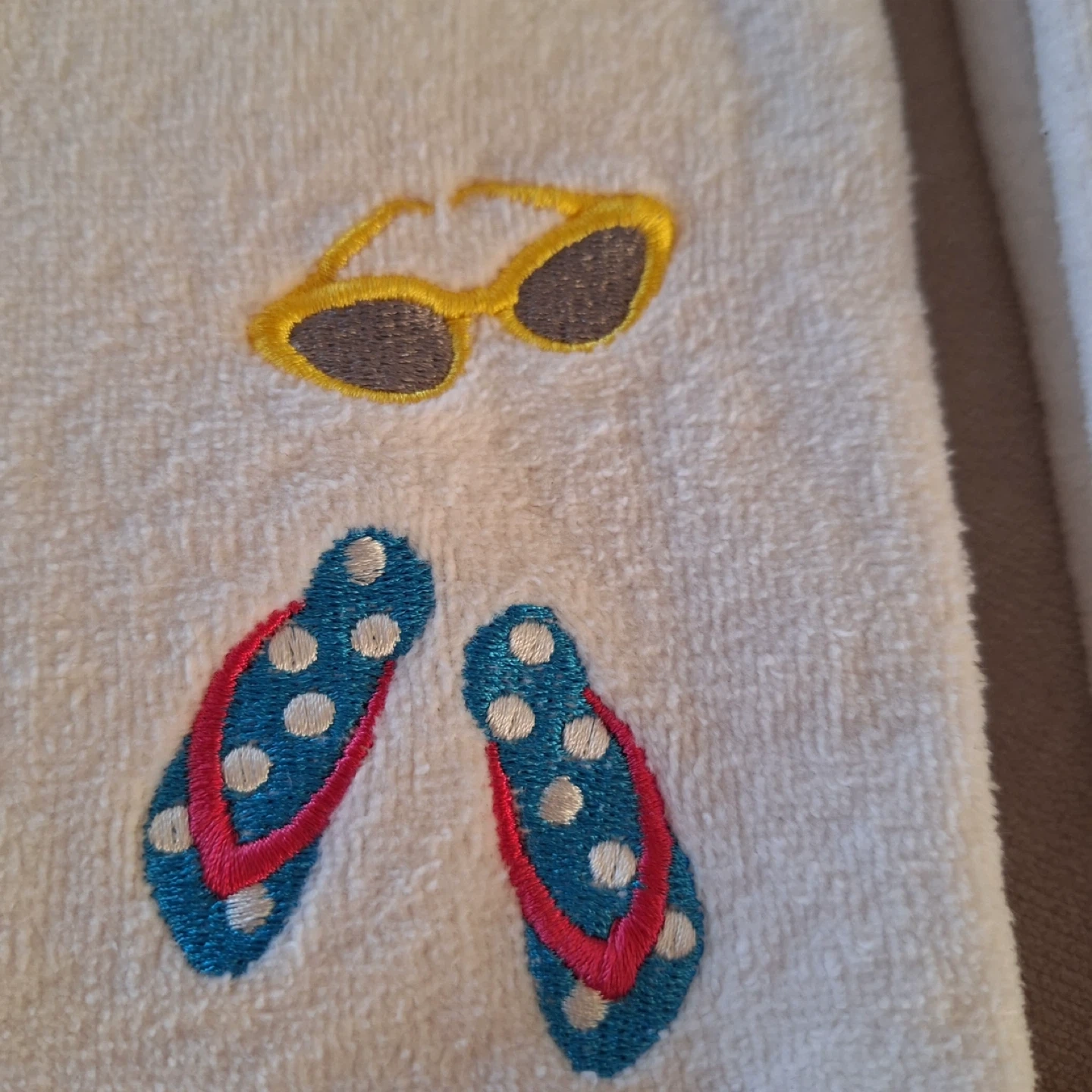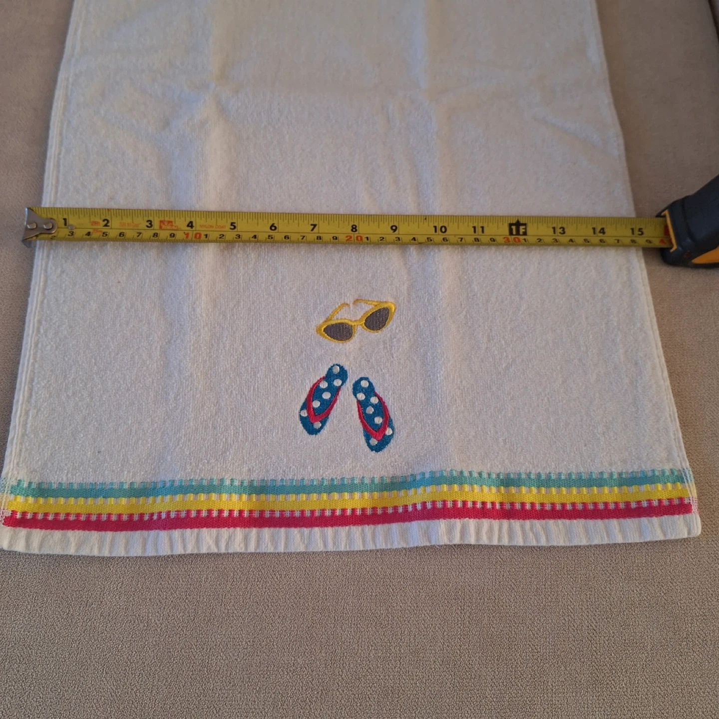 Here's a set of two SKL Home hand towels, perfect for adding a touch of summer to your bathroom or kitchen! 15x 23.They feature a cute embroidered design with sunglasses and flip-flops, plus a colourful striped border. They are made of 100% cotton.