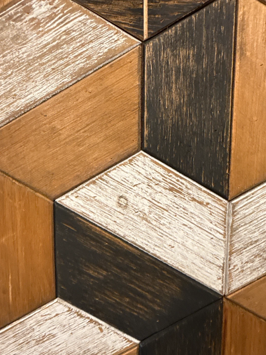 Looking to add a unique piece to your home decor? This geometric wood wall art is perfect! It features a cool, dimensional design with a mix of natural wood tones, white, and black. It's sure to catch the eye and add some character to any room