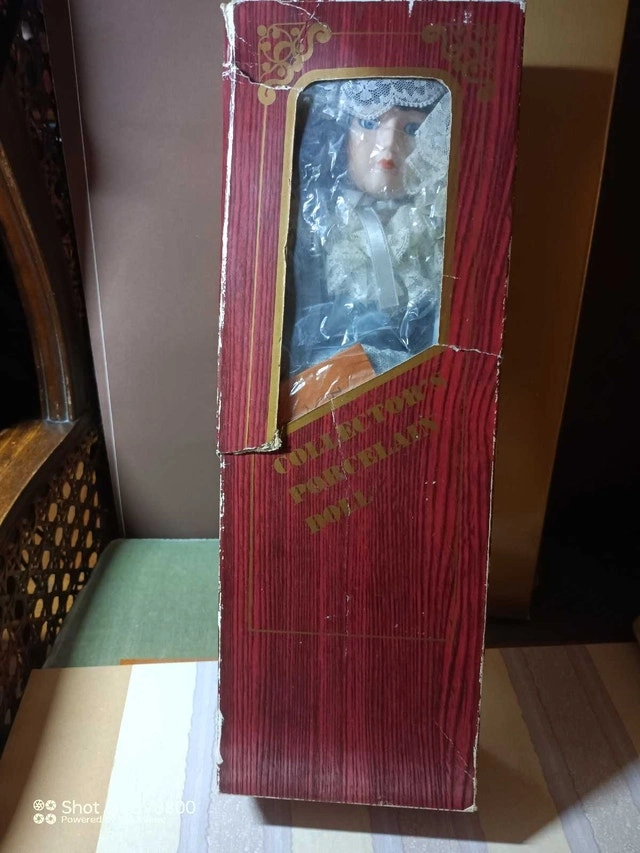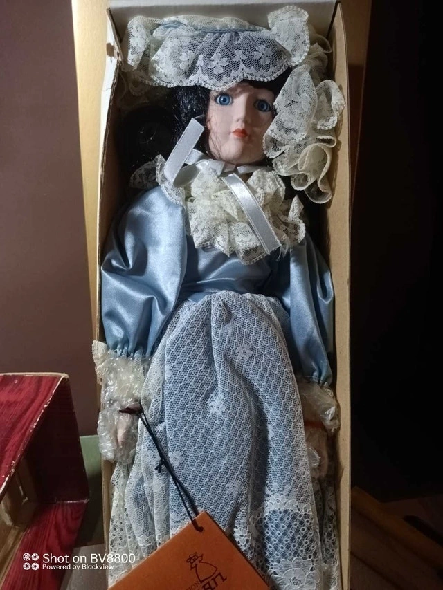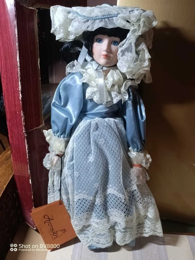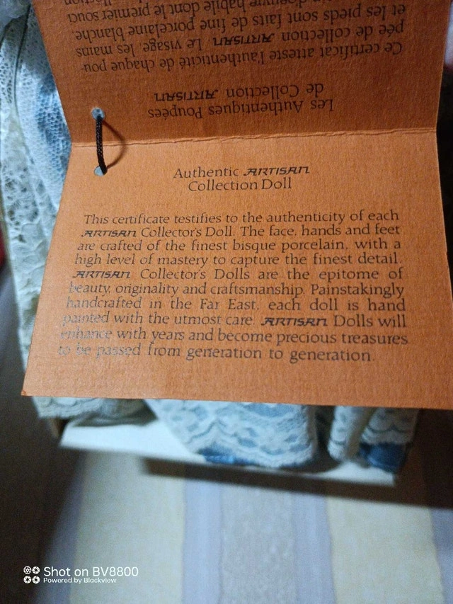 This is a beautiful Artisan porcelain doll, a true collector's item with its delicate bisque porcelain face, hands, and feet, handcrafted in the Far East. It comes complete with its original box and certificate of authenticity. This doll has been previously displayed. It's in good condition and ready to be a treasured addition to your collection. If the ad is up, it's still available.