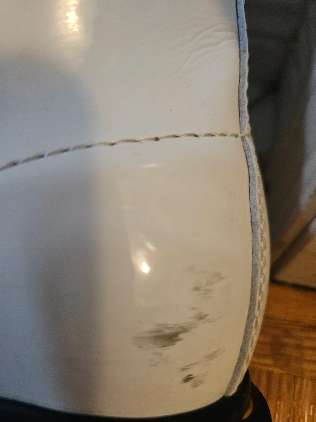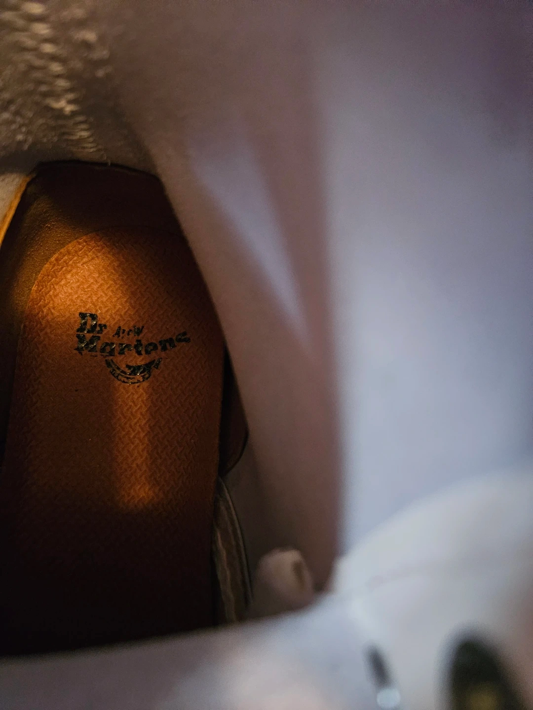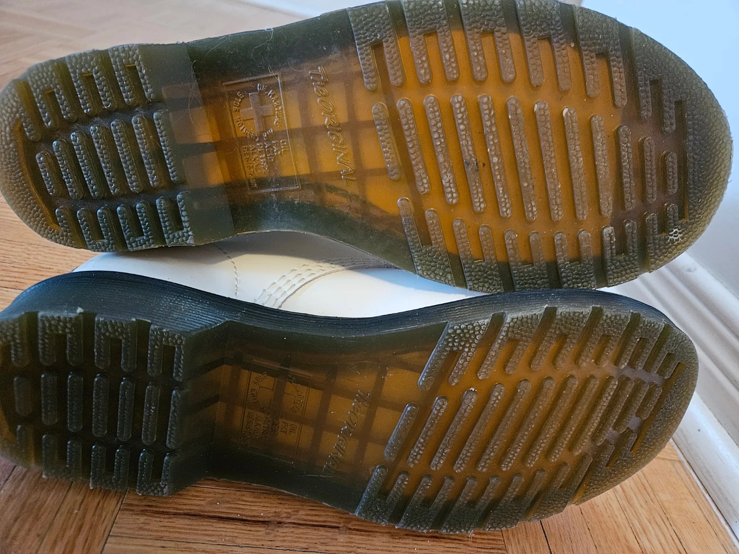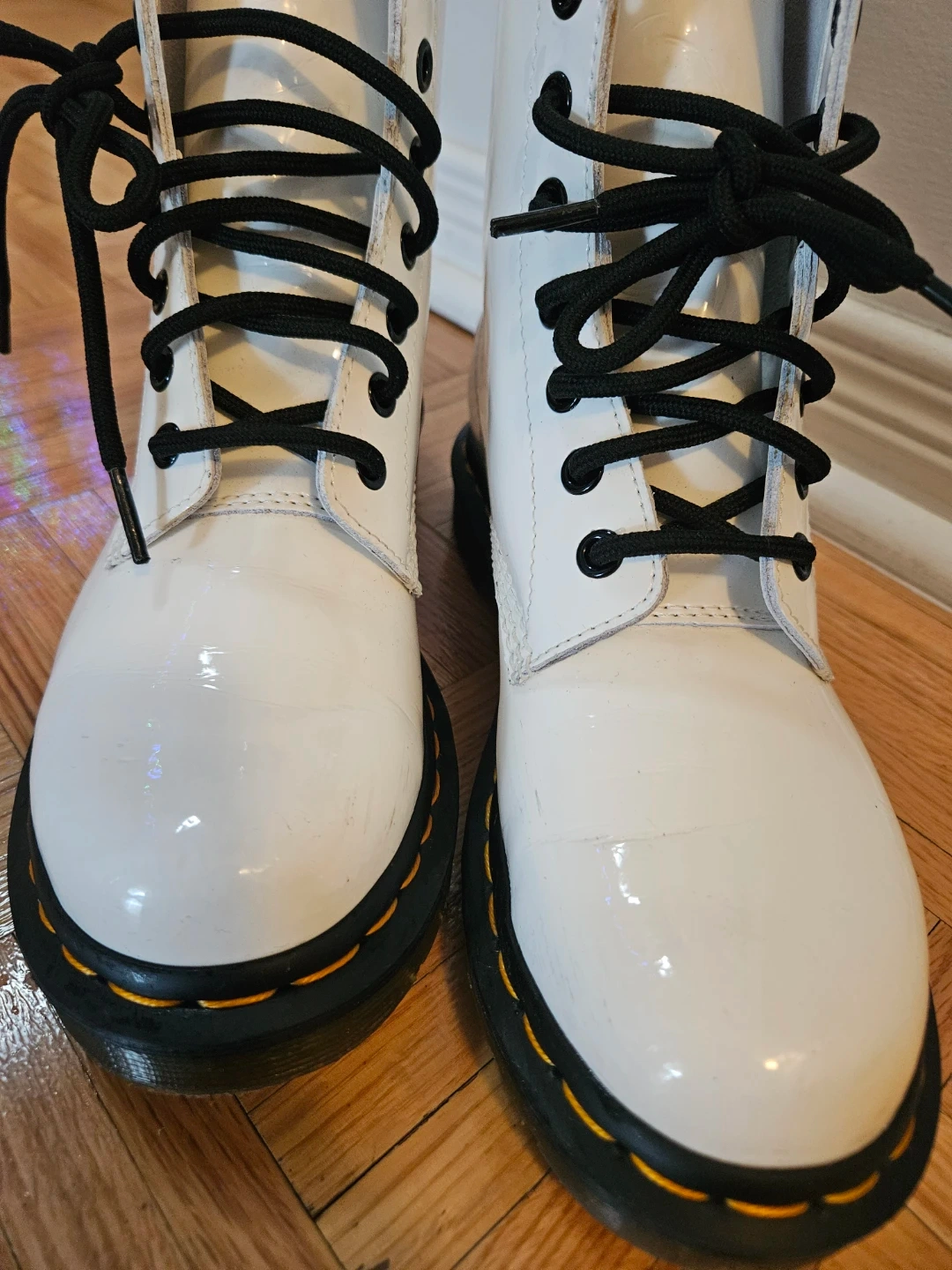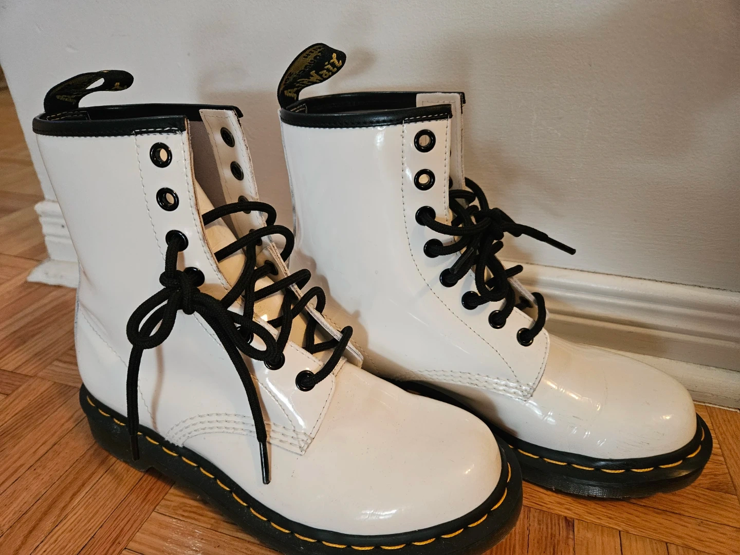 Selling a pair of Dr. Martens boots in white patent leather. They have some signs of wear, as shown in the pictures. These boots are super stylish and ready for a new owner!