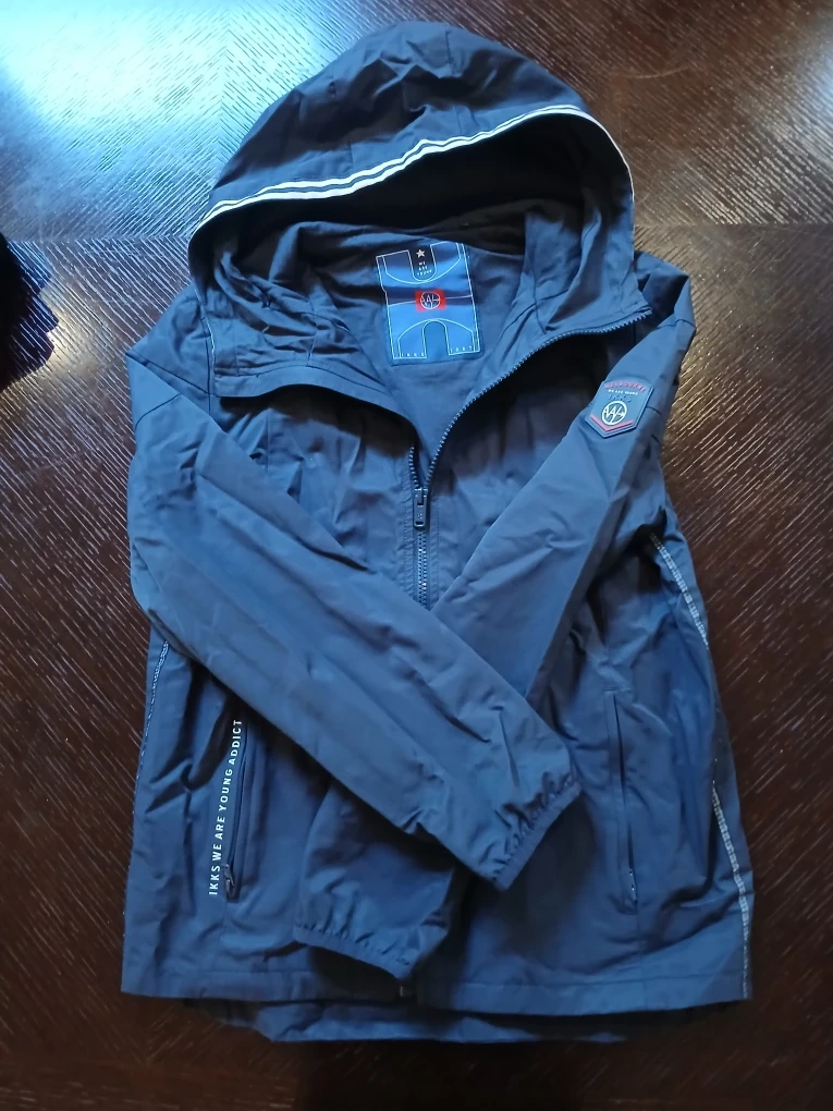 Selling a blue hooded jacket from IKKS. It has a zipper and a hood with white stripes. The jacket has the text "IKKS WE ARE YOUNG ADDICT" on the side.