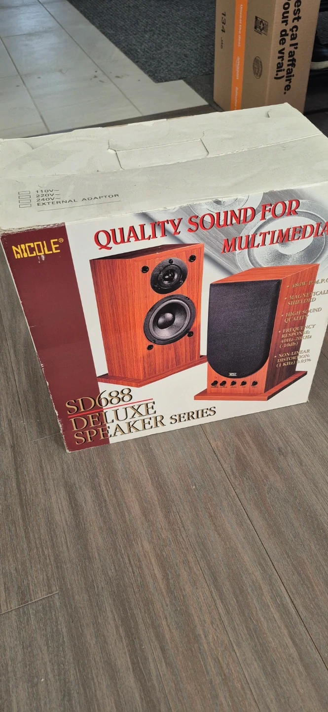 Selling a set of Nicole SD688 Deluxe speakers! These speakers are designed for multimedia use and deliver quality sound. The box indicates they are magnetically shielded for high sound quality and feature a frequency response of 40Hz-20KHz. They have a maximum power of 480W P.M.P.C.