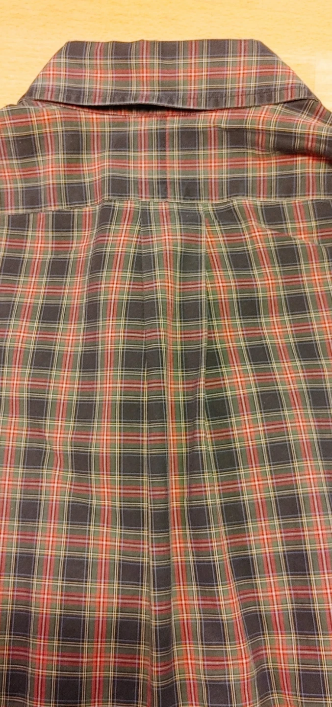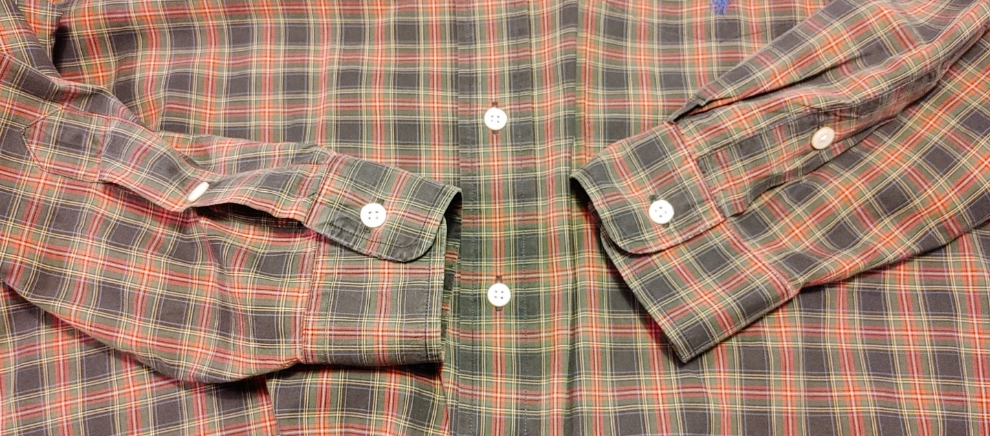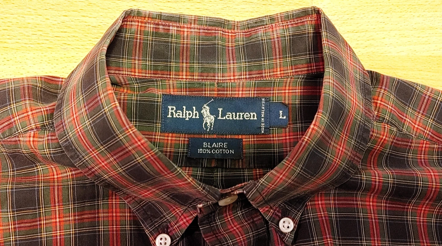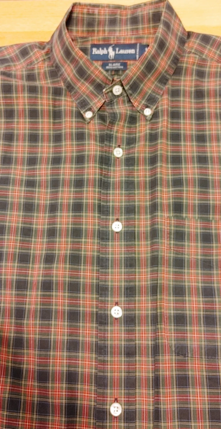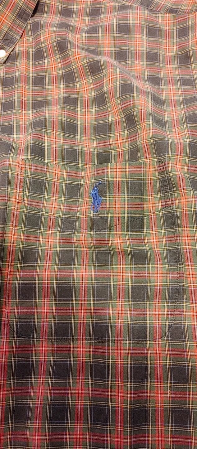 Mens size L Ralph Lauren plaid button-down Oxford shirt. Features a classic plaid pattern in shades of red, green, and black. The shirt has a button-down collar and a chest pocket with the signature Ralph Lauren logo. Excellent condition, like new. No rips, stains or fraying. All buttons present. Smoke free home pick up Mt Brydges cash only.