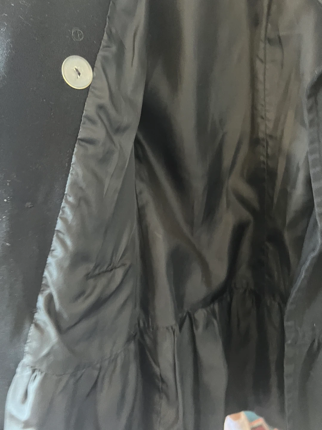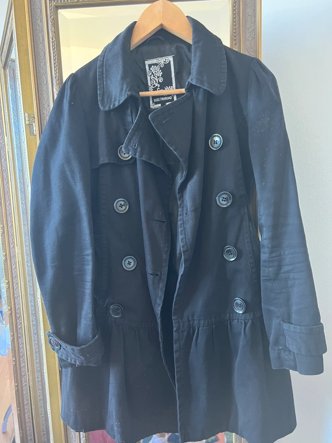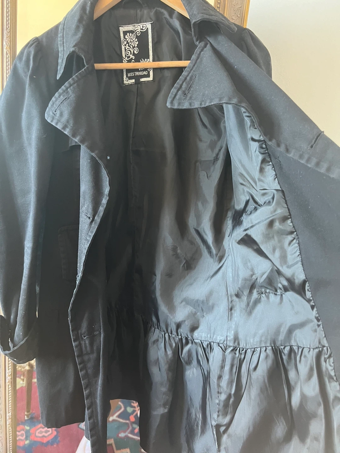 Gently Worn. Bought in Paris.Has a good Karma. Female or/and unisex coat with lining I'm selling a stylish black trench coat from Miss Trinidad! It features a classic double-breasted design with a ruffled hem. It's perfect for layering and adding a touch of sophistication to any outfit. It's in good condition and ready for a new owner!