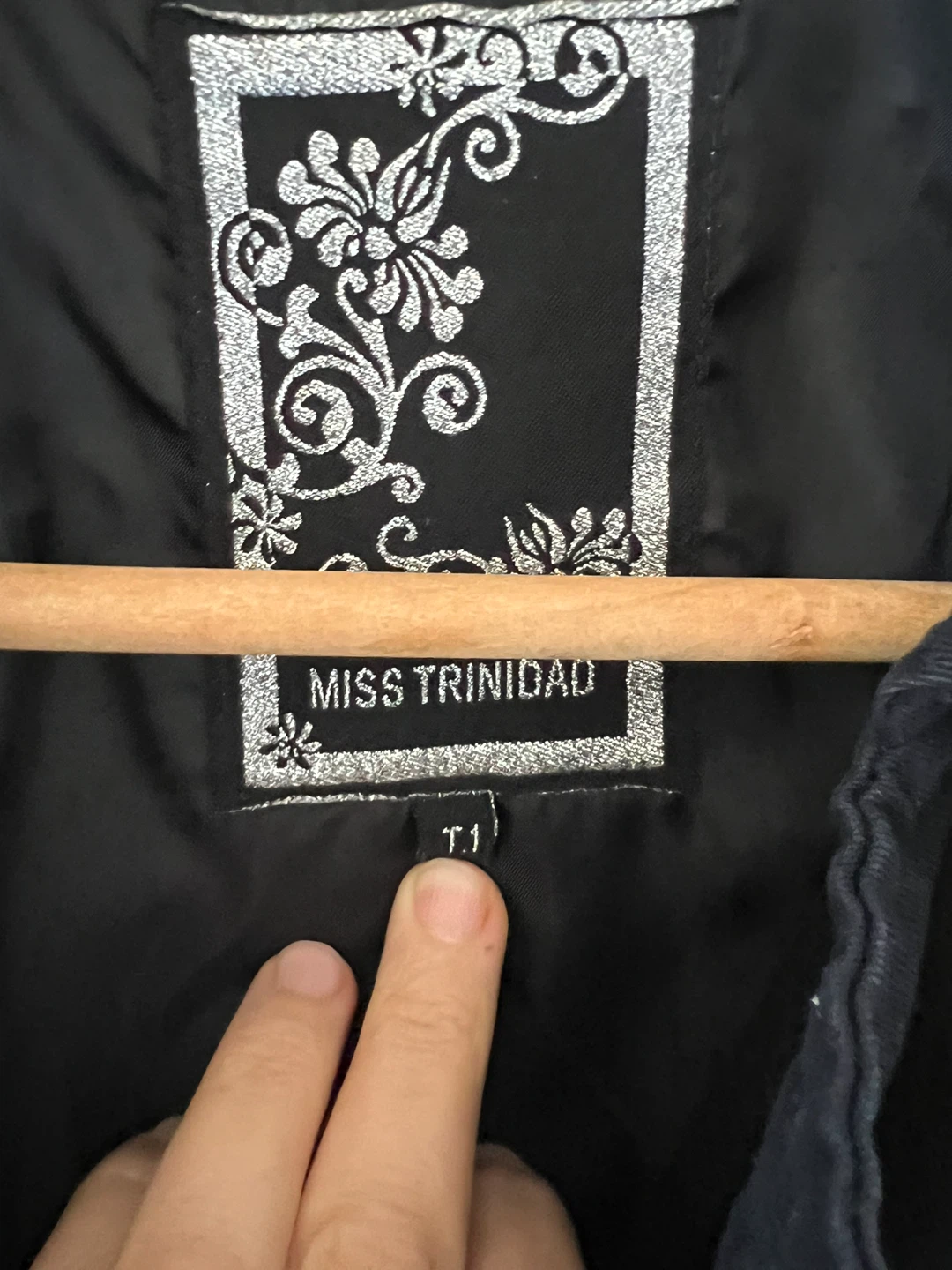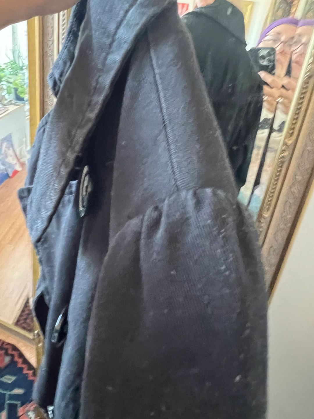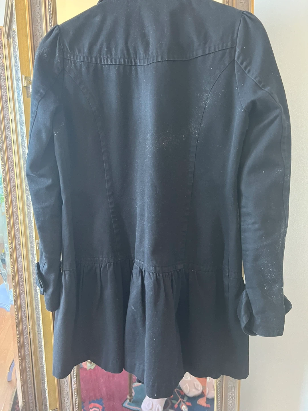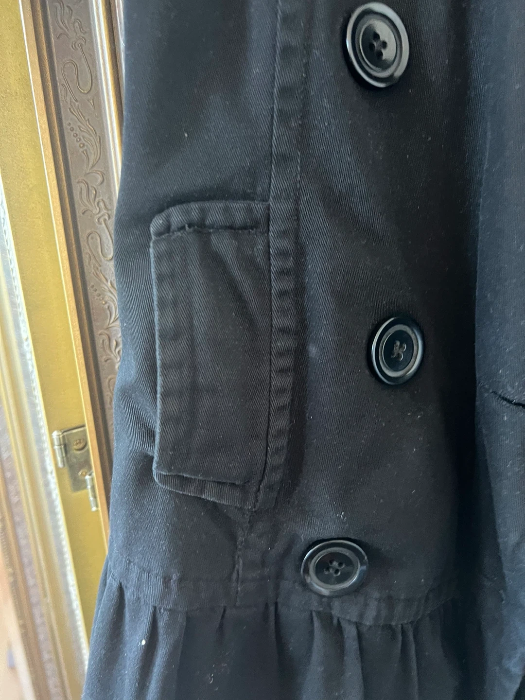 Gently Worn. Bought in Paris.Has a good Karma. Female or/and unisex coat with lining I'm selling a stylish black trench coat from Miss Trinidad! It features a classic double-breasted design with a ruffled hem. It's perfect for layering and adding a touch of sophistication to any outfit. It's in good condition and ready for a new owner!