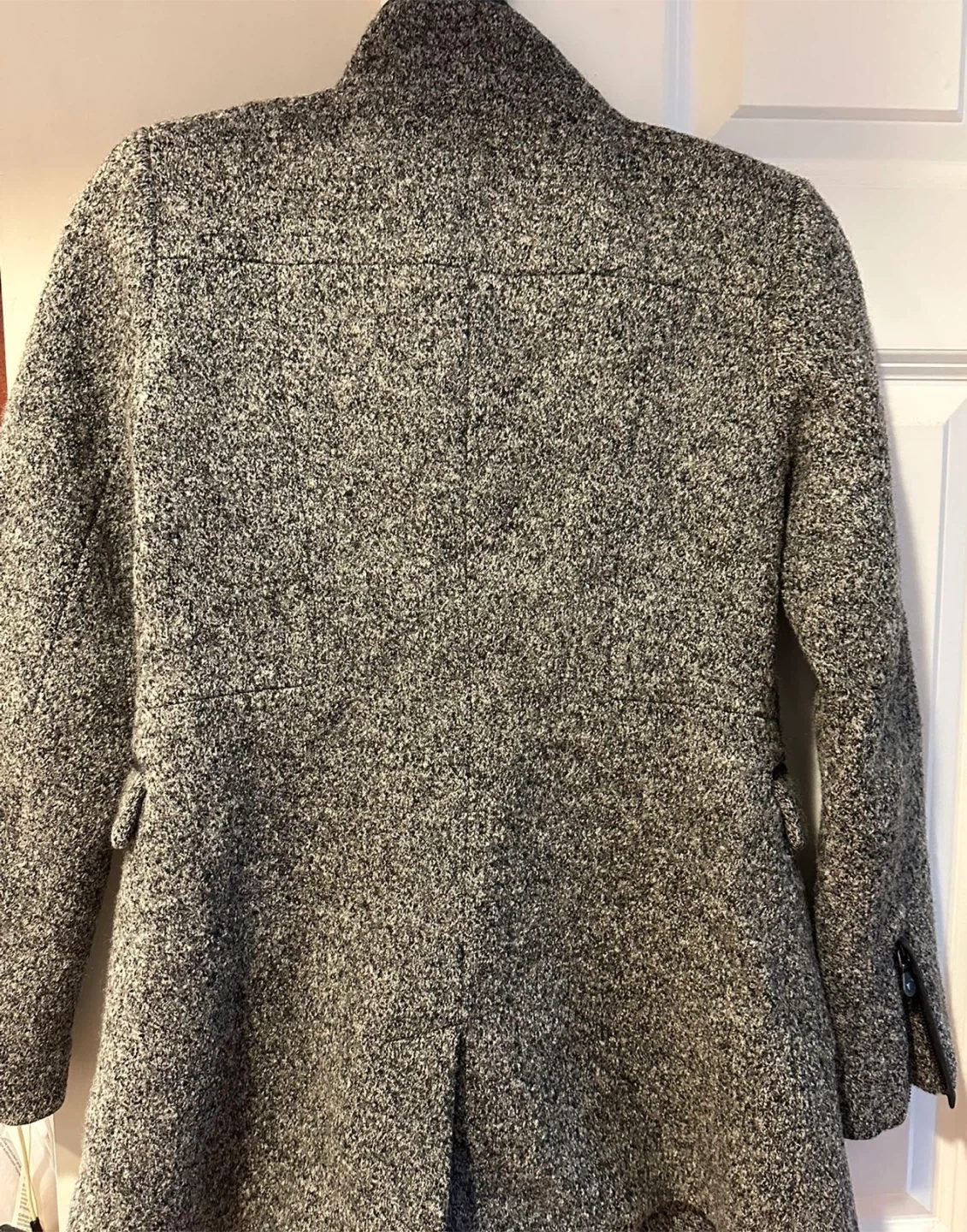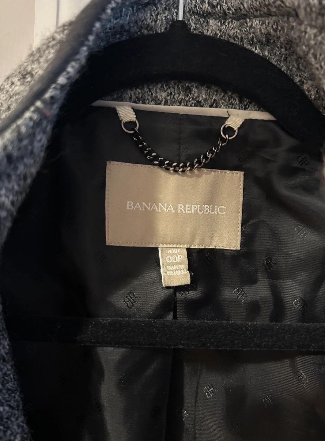 Selling a used Banana Republic coat in size Petite 00. The outer shell is made of 59% viscose, 41% wool, and the body lining is 65% polyester with 35% spandex. The sleeve lining is 100% polyester