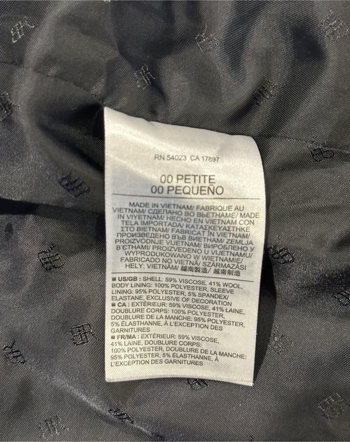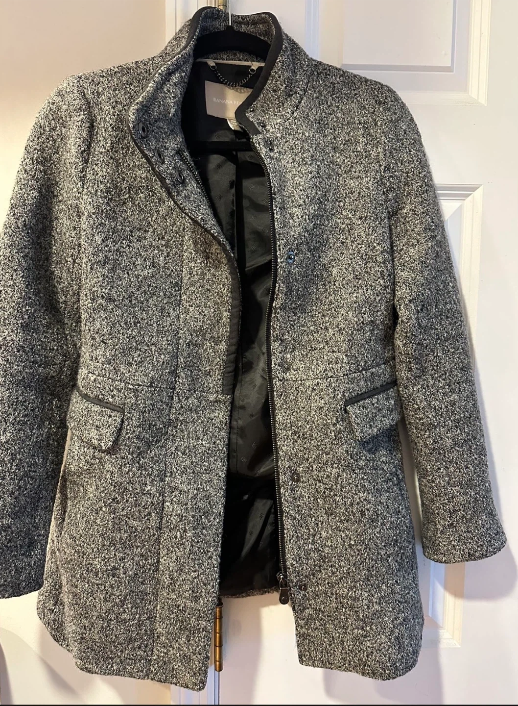 Selling a used Banana Republic coat in size Petite 00. The outer shell is made of 59% viscose, 41% wool, and the body lining is 65% polyester with 35% spandex. The sleeve lining is 100% polyester