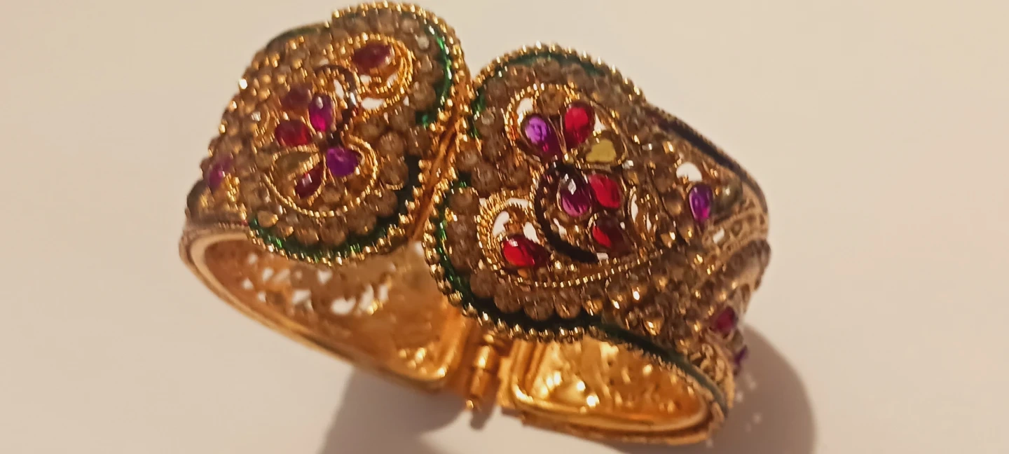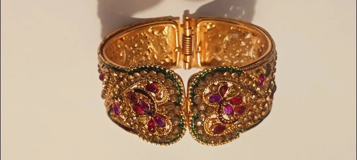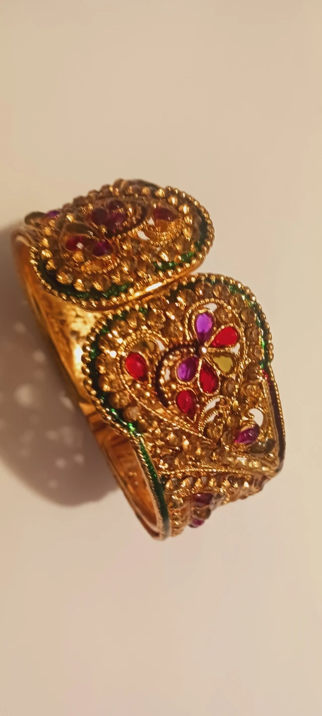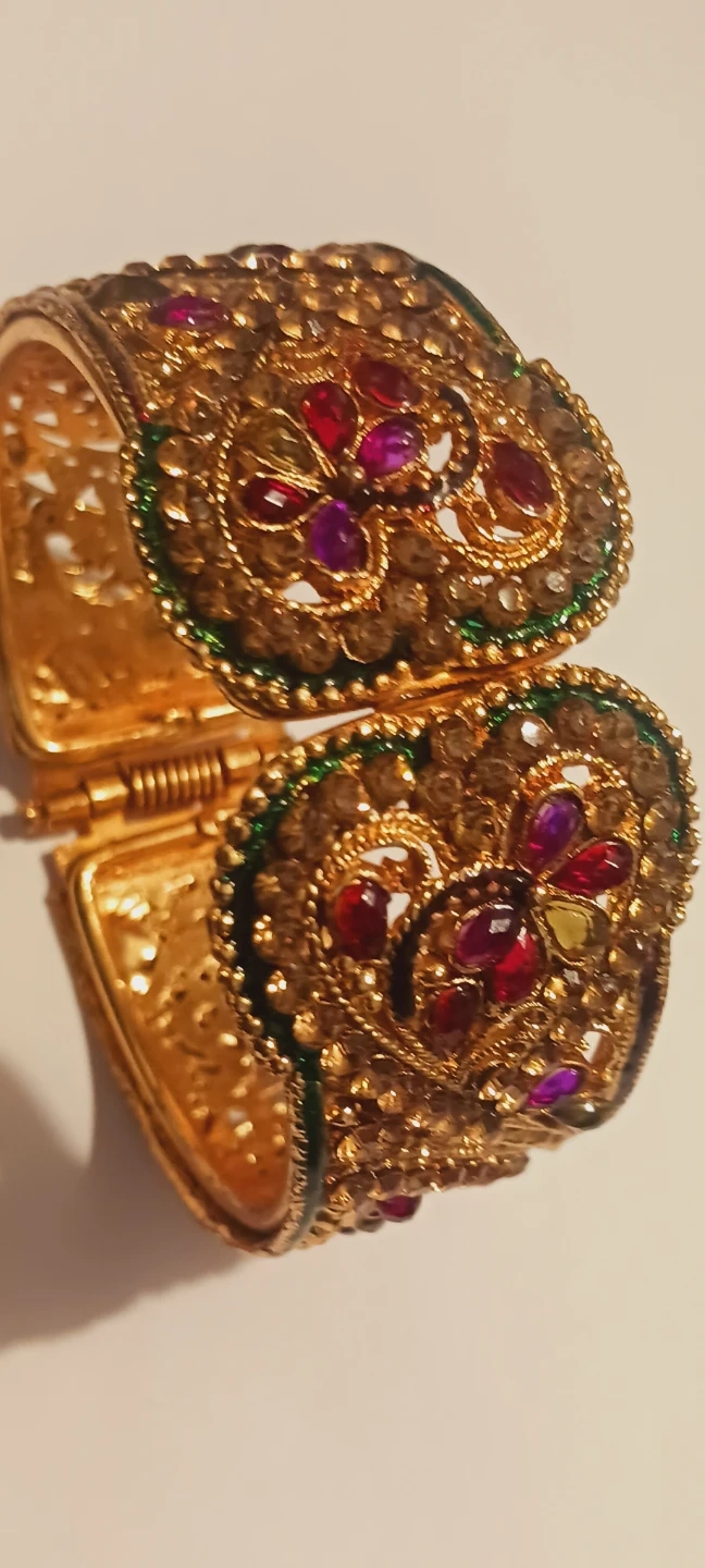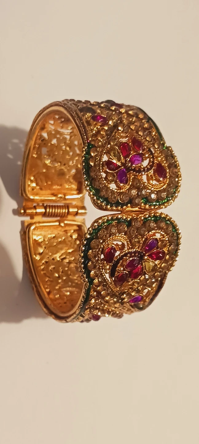 Gorgeous Indian Gemstones Gold Tone hinged bangle bracelet with intricate detailing and colorful stones .It's in excellentcondition and ready to add a touch of elegance to your style! EXCELLENT CONDITION. ALL MY PRICES ARE NEGOTIABLE !! 3" Adjustable size. Made in India.