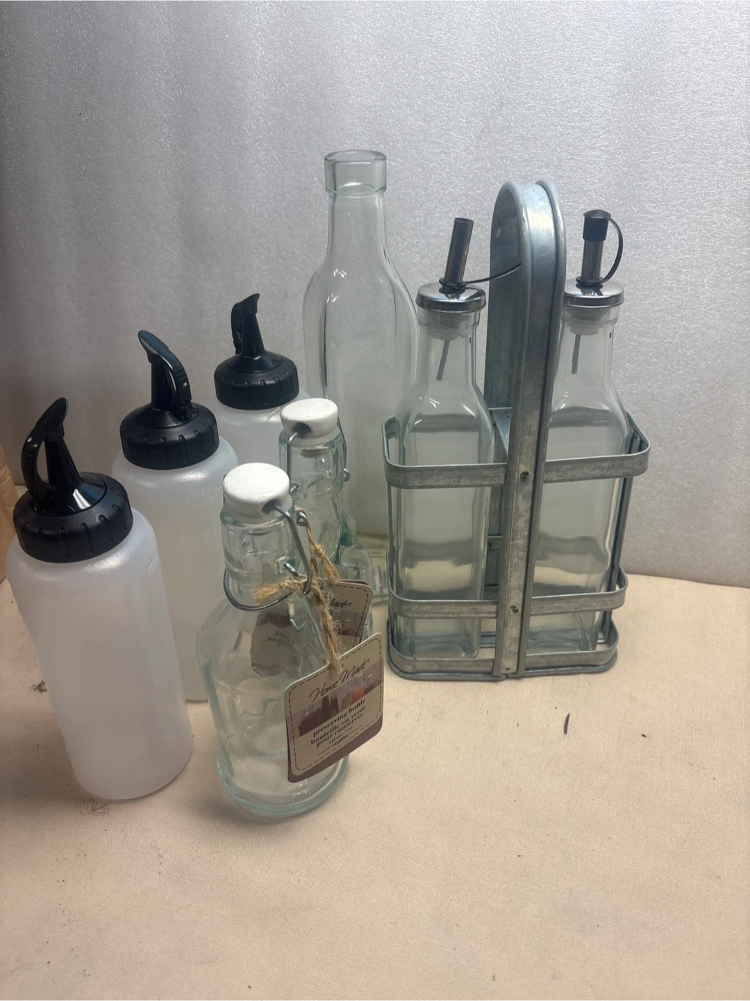 Selling a set of various oil and vinegar dispenser bottles. They're perfect for adding a touch of rustic charm to your kitchen or dining table. Great for storing and dispensing your favourite oils, vinegars, or homemade dressings! They're in great condition and ready to use