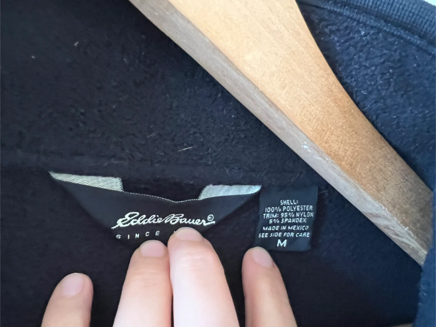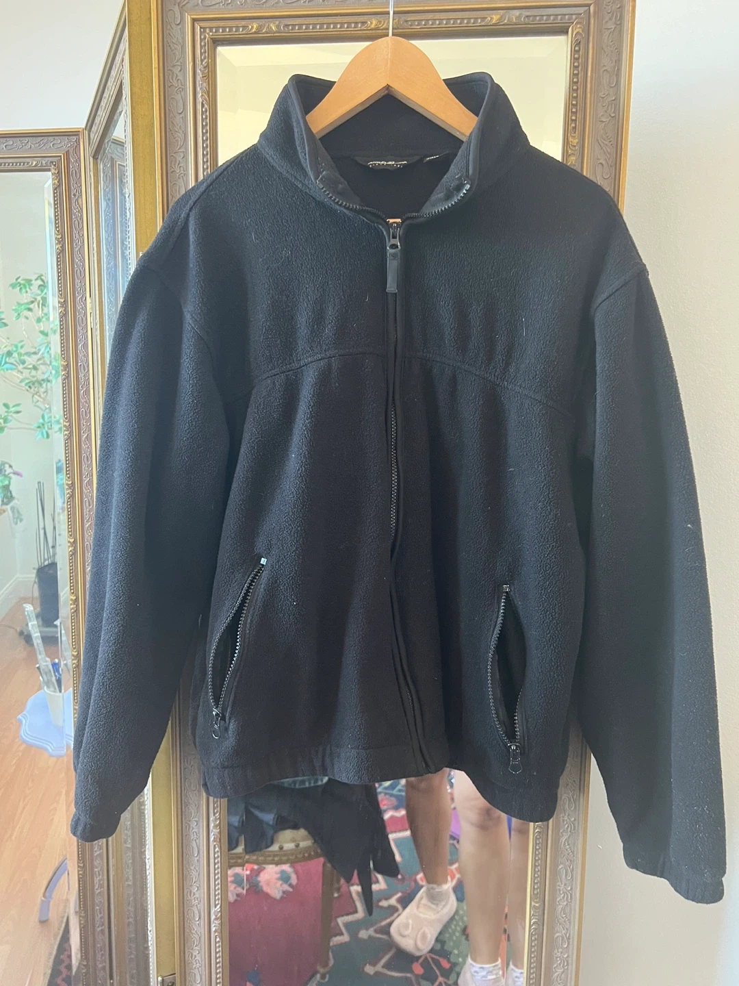 Selling a gently used Eddie Bauer fleece jacket in black. It's a size medium and made of 100% polyester shell with 95% nylon and 5% spandex trim. Perfect for layering or wearing on its own!Has a good Karma.Unisex.