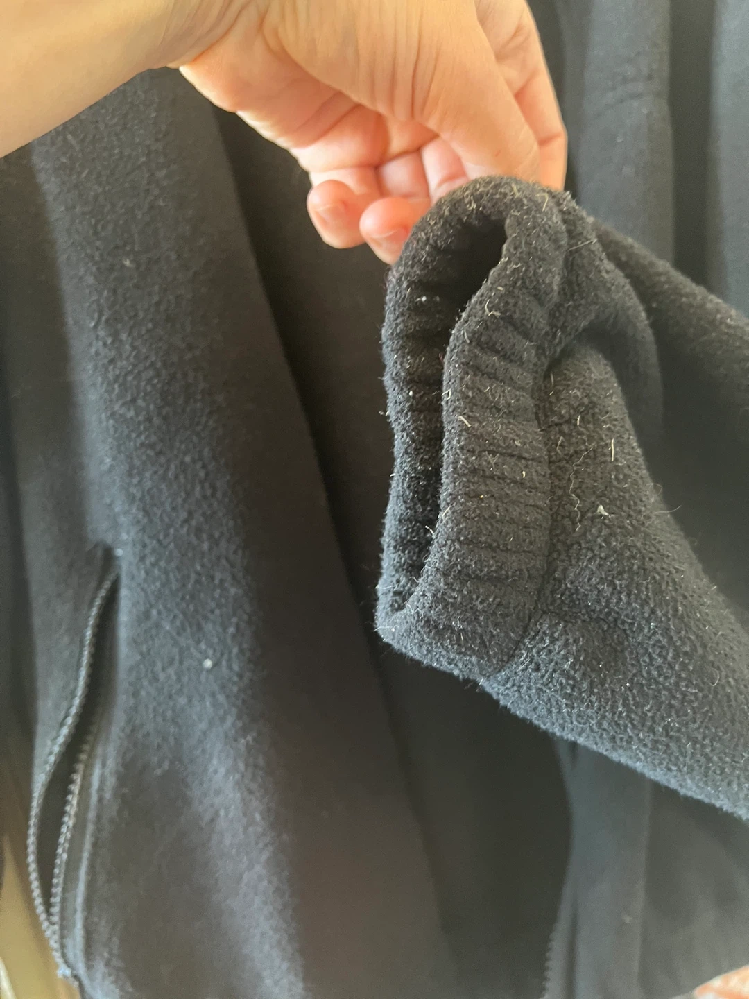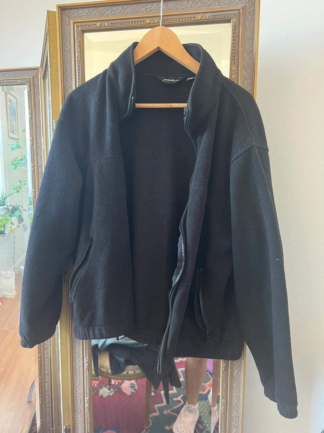 Selling a gently used Eddie Bauer fleece jacket in black. It's a size medium and made of 100% polyester shell with 95% nylon and 5% spandex trim. Perfect for layering or wearing on its own!Has a good Karma.Unisex.