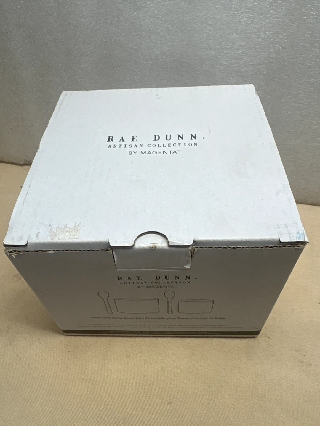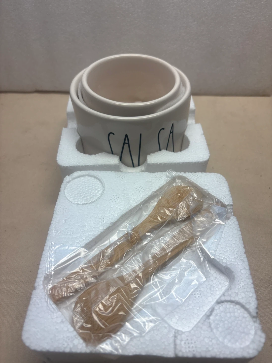 Selling a brand new Rae Dunn Artisan Collection Salsa and Guacamole bowl set by Magenta! It comes with two wooden spoons and is still in the original packaging