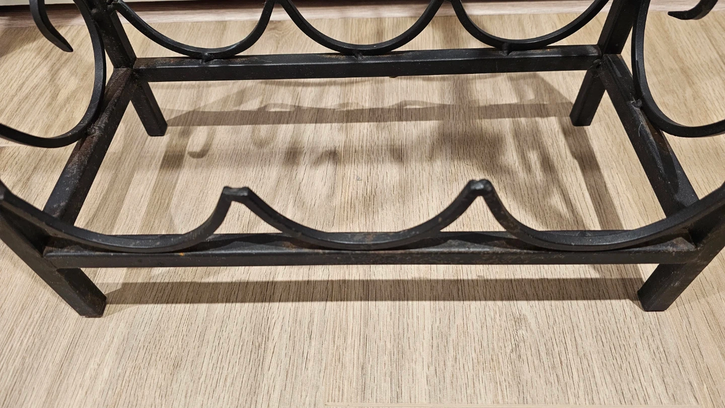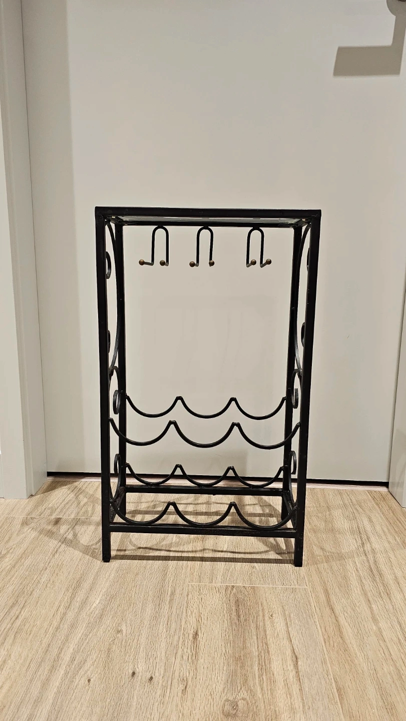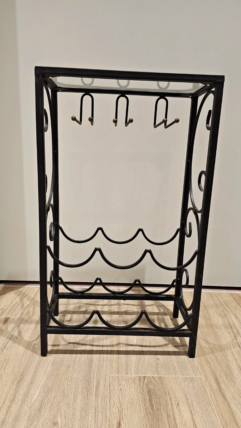 Selling a black metal wine rack with a glass top! It has a stylish, wrought iron design, and space for both wine bottles and glasses.