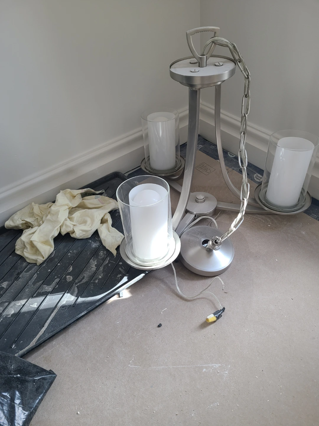 Selling a chandelier with candle holders. It's in good condition and would look great in a dining room or entryway. The chandelier features a silver finish and glass candle holders for a warm and inviting glow