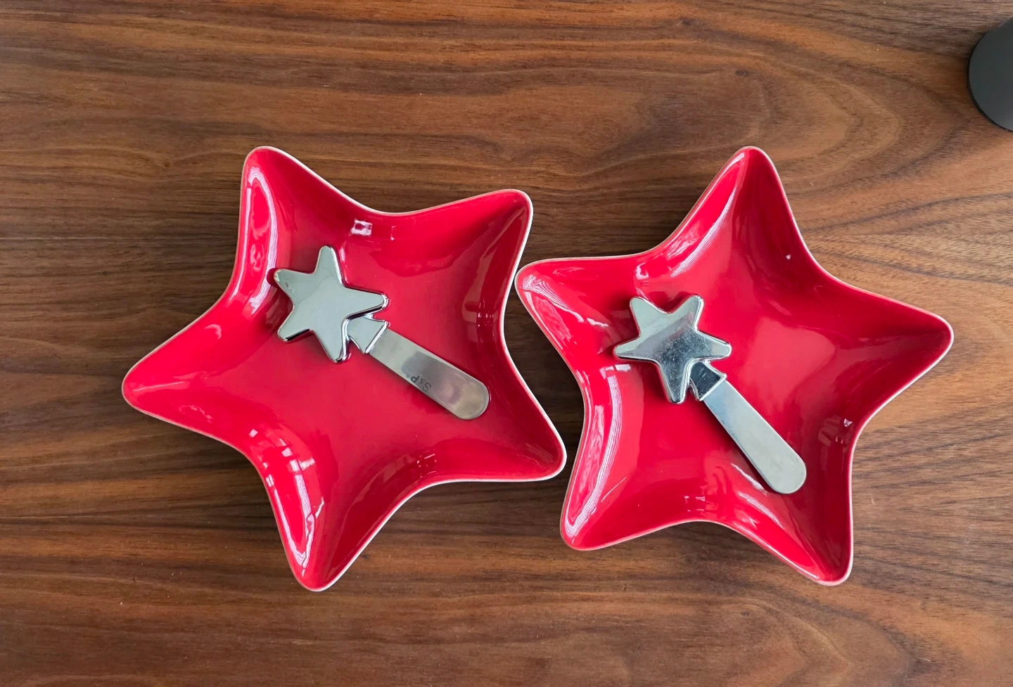 Two red star-shaped cheese, pate, or snack serving dishes by Stokes.