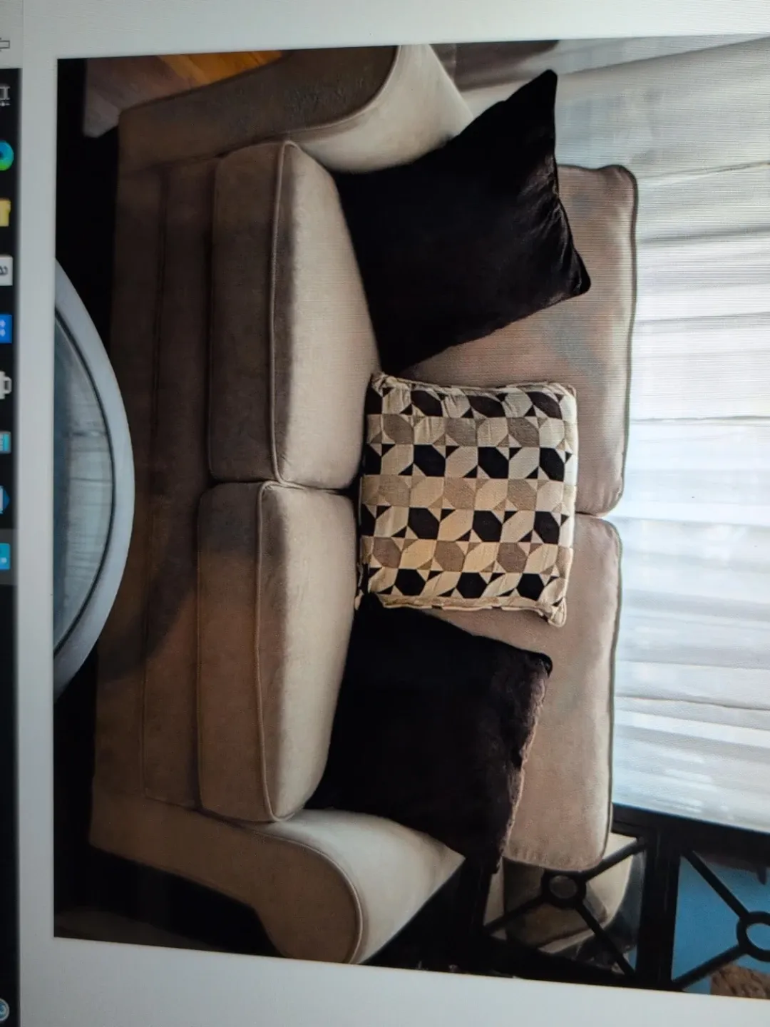 Selling a comfortable beige loveseat sofa. It comes with a few decorative pillows to complete the look. The sofa is in good condition and ready for a new home!