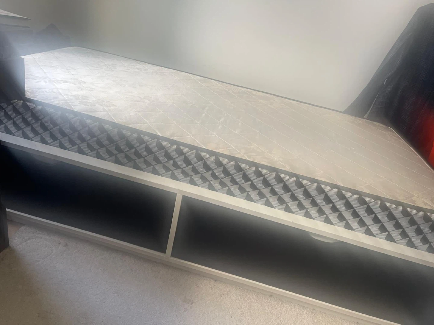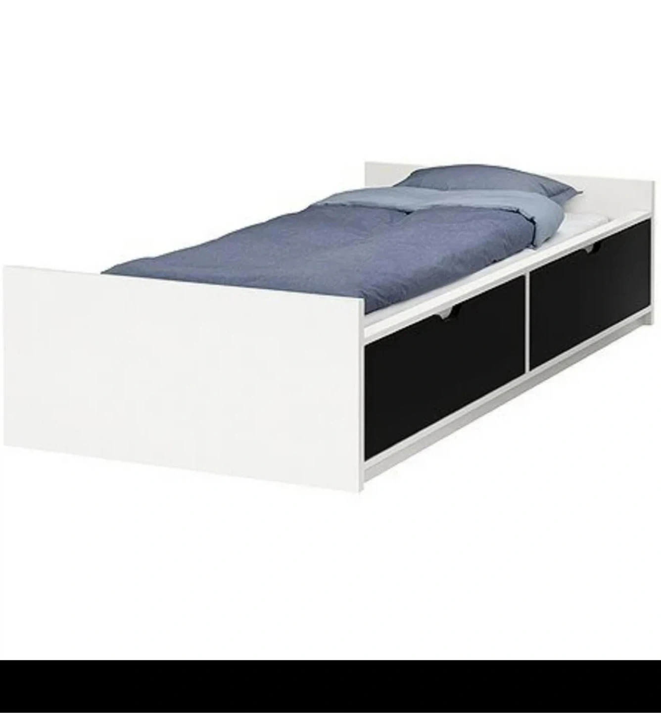Selling a **white twin-size IKEA-style bed frame with built-in storage drawers and slatted bed base**. Perfect for a kid’s room, guest room, or small space.