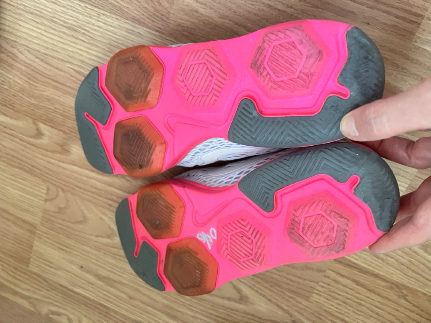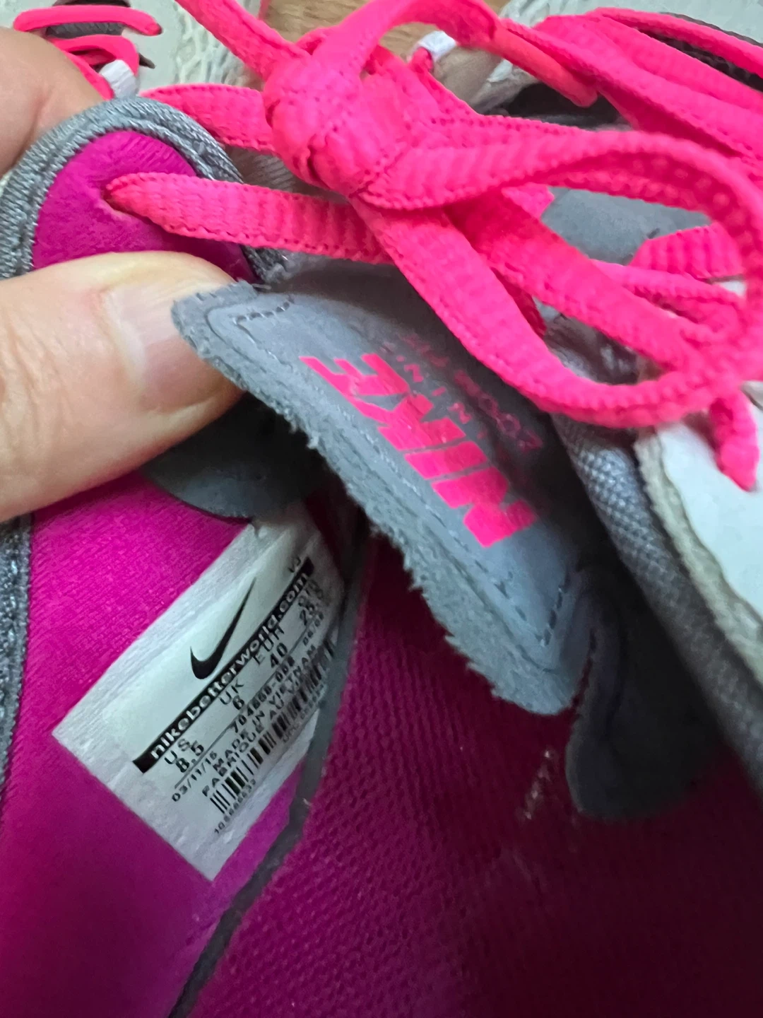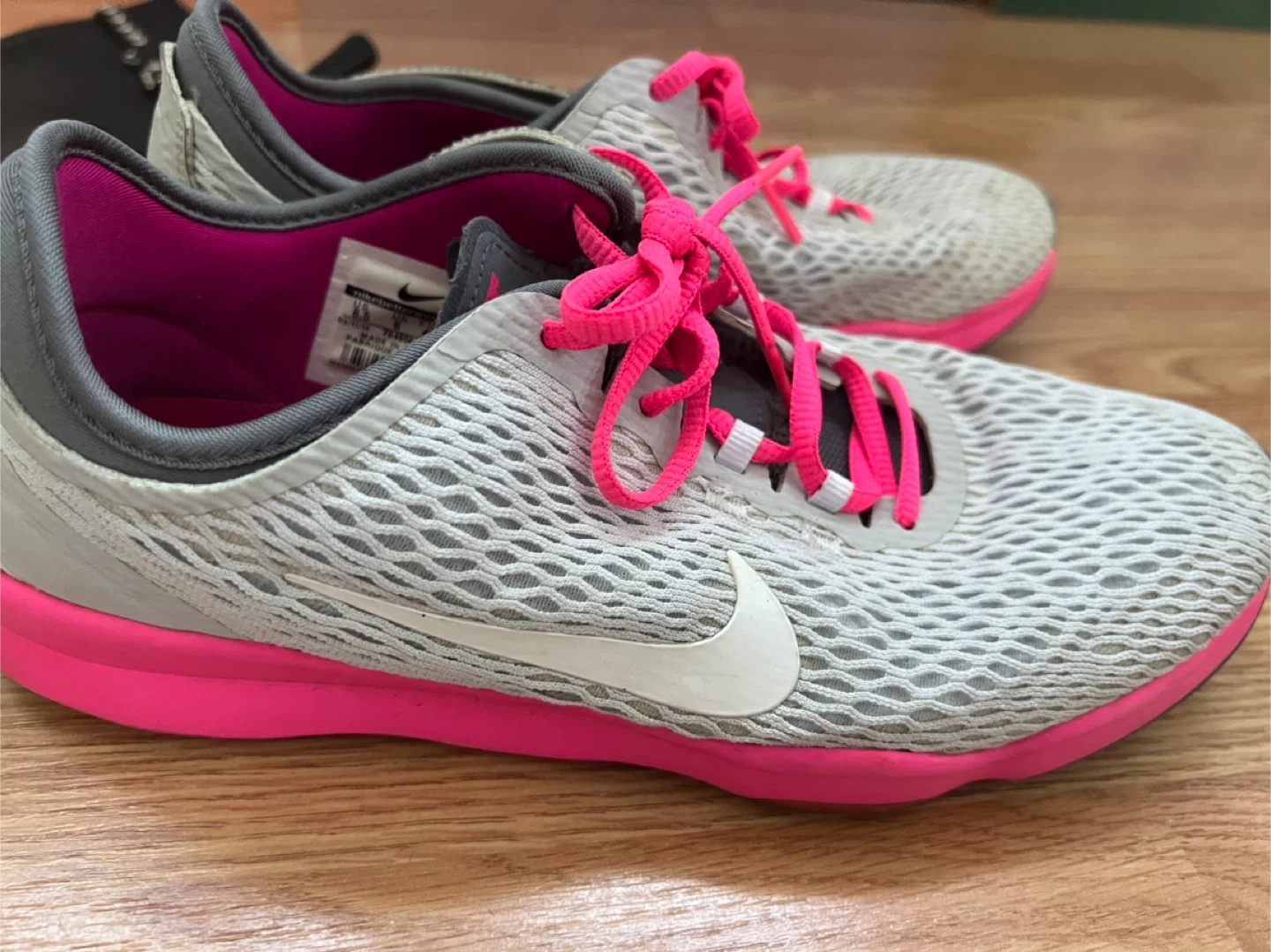Selling a pair of Nike Zoom running shoes in women's size 8.5. They feature a gray and white upper with vibrant pink accents on the laces and sole. Great for running or everyday wear!