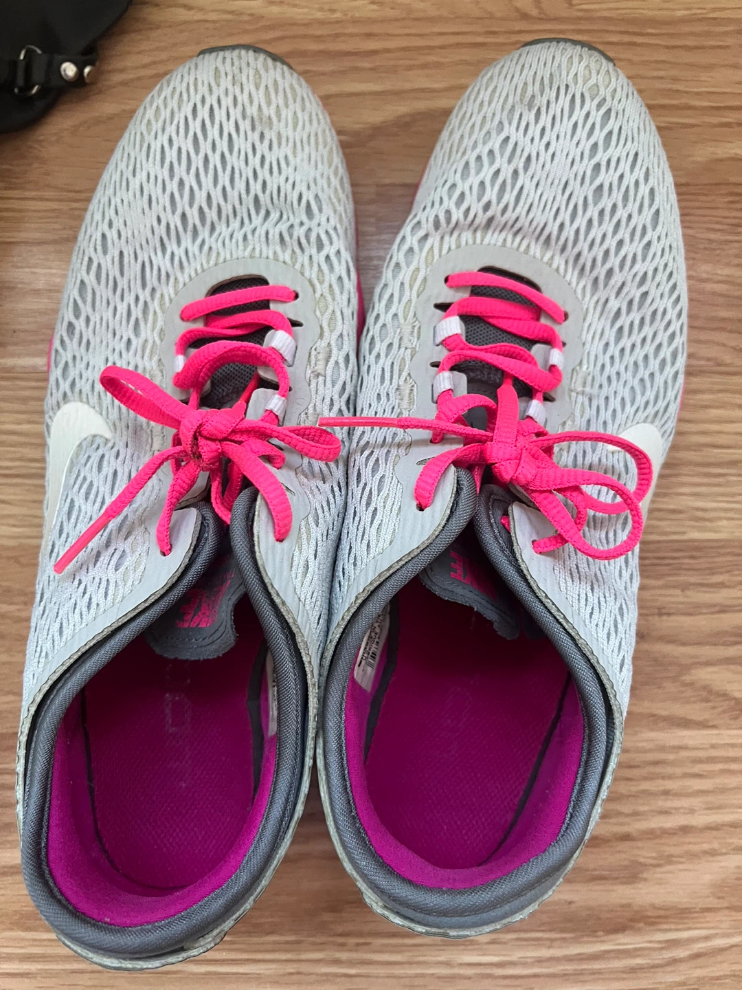 Selling a pair of Nike Zoom running shoes in women's size 8.5. They feature a gray and white upper with vibrant pink accents on the laces and sole. Great for running or everyday wear!
