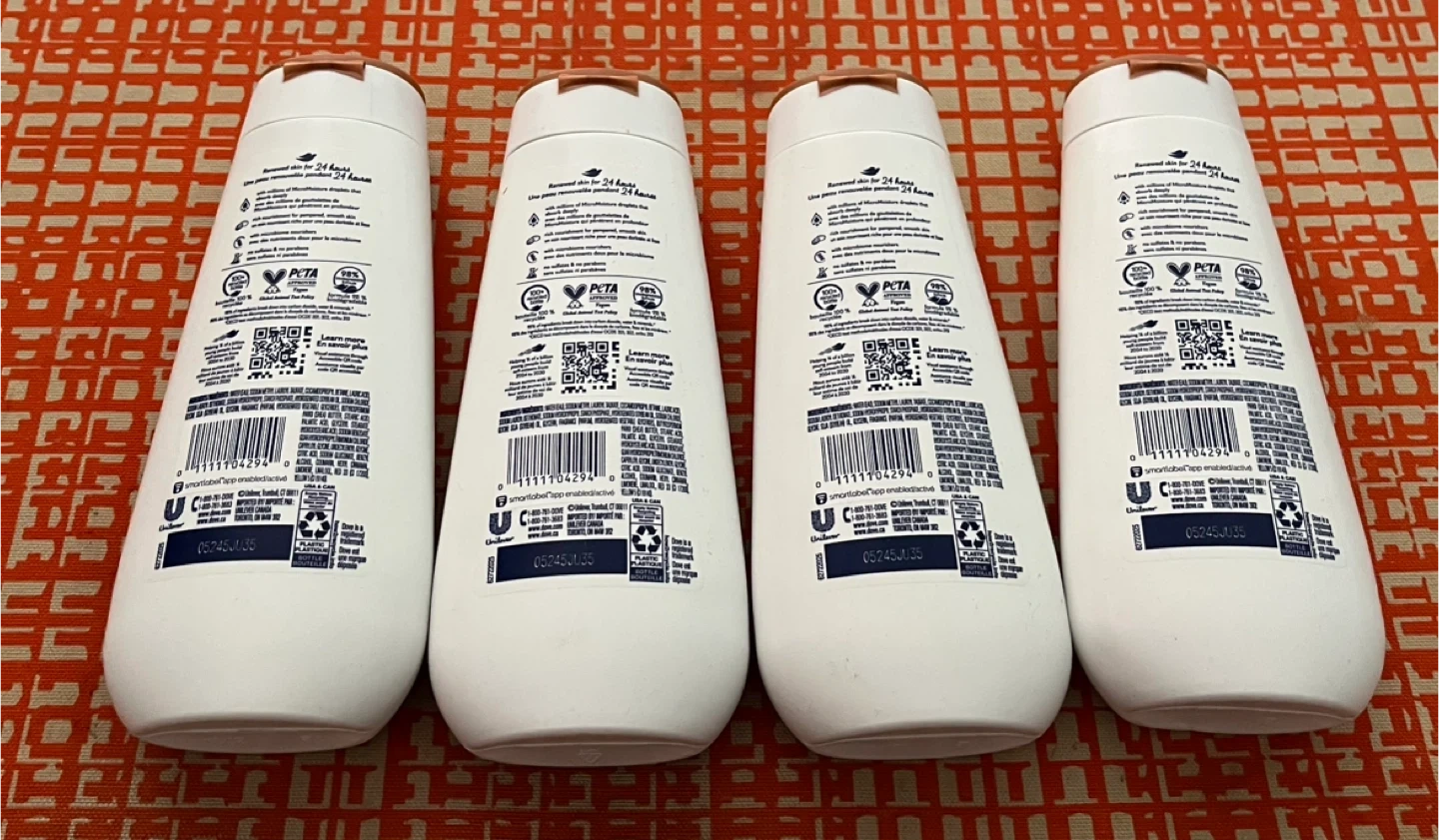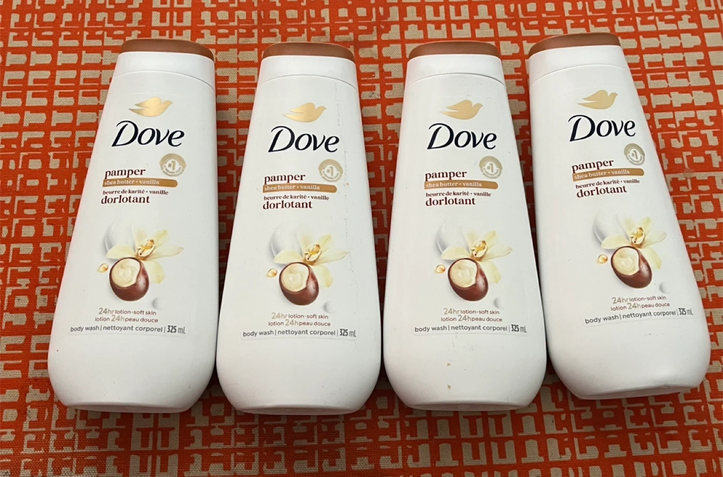 Selling four bottles of Dove Pamper Shea Butter & Vanilla body wash. Each bottle contains 325 mL of lotion-soft skin body wash. Perfect for adding a touch of luxury to your daily routine!