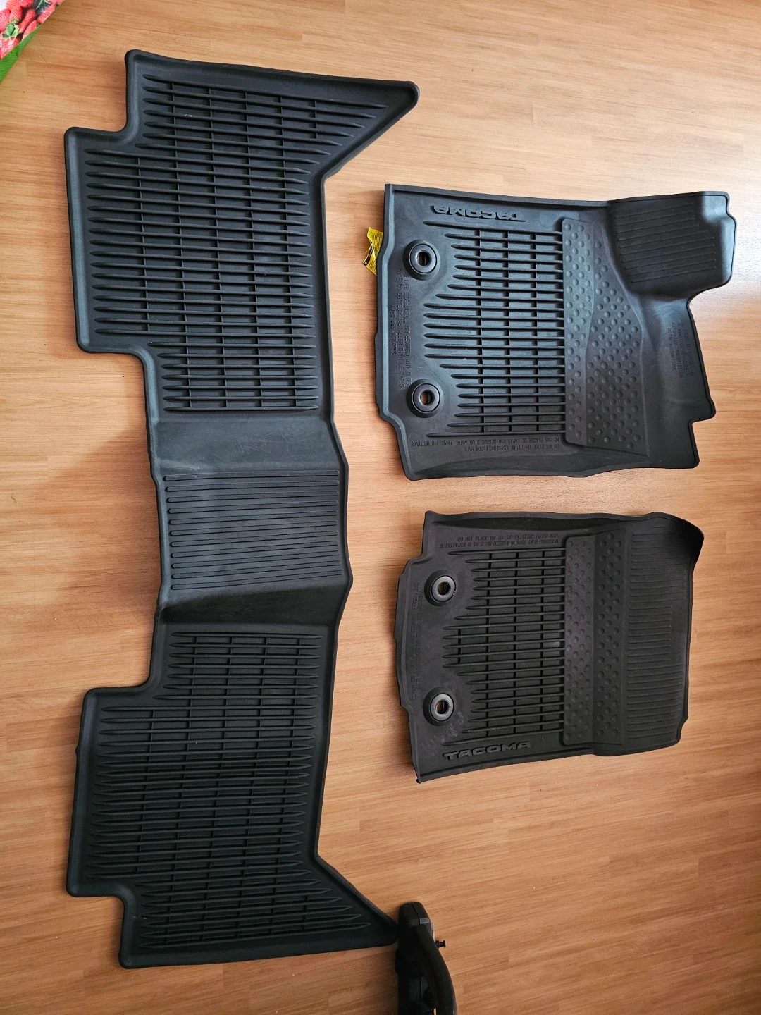 Selling a set of all-weather floor mats for a Toyota Tacoma. These mats are black and designed to protect your car's interior from dirt, mud, and water. They are durable and easy to clean, making them perfect for any weather condition
