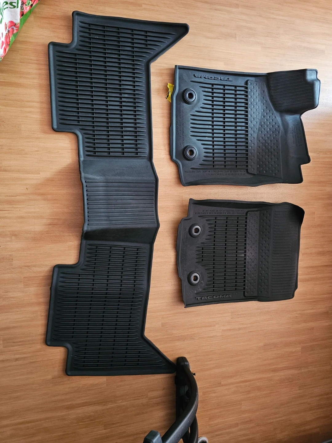 Selling a set of all-weather floor mats for a Toyota Tacoma. These mats are black and designed to protect your car's interior from dirt, mud, and water. They are durable and easy to clean, making them perfect for any weather condition