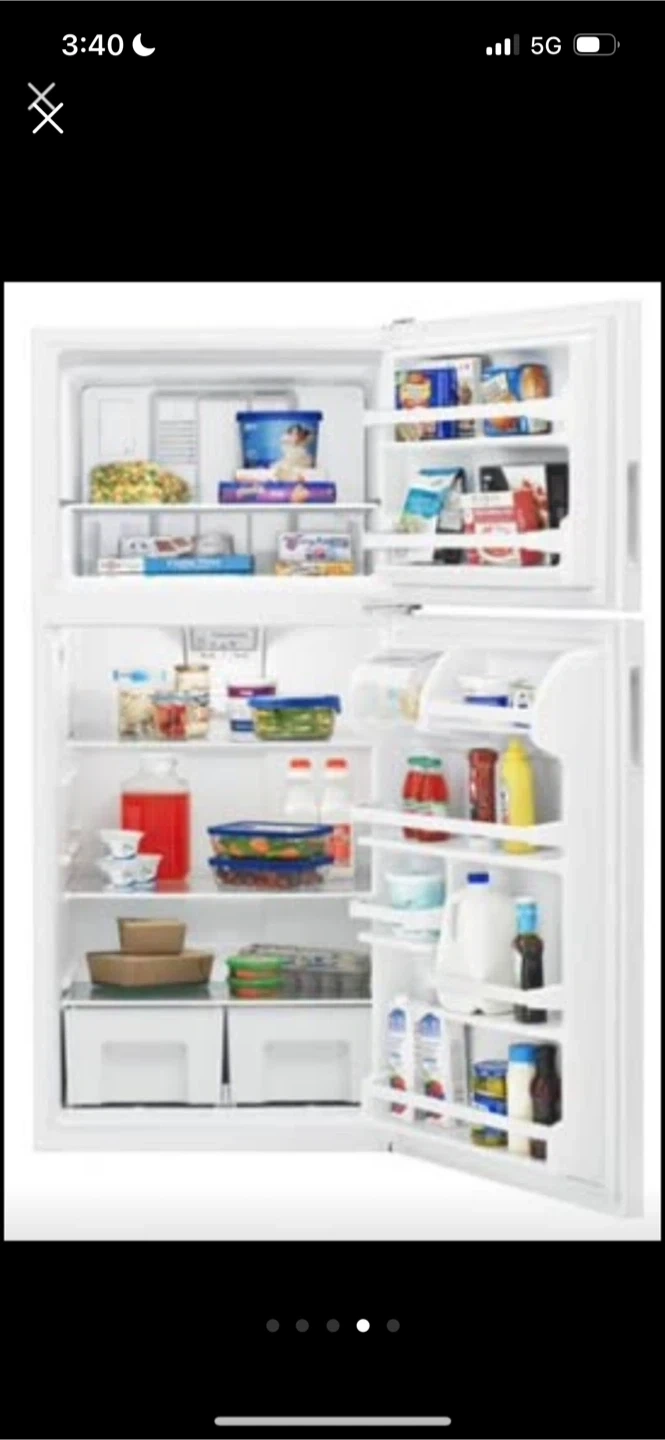 Selling a top freezer refrigerator in white. It has adjustable temperature settings to keep your food fresh. Inside, you'll find plenty of shelving and storage options for all your groceries. Perfect for a small family or apartment!