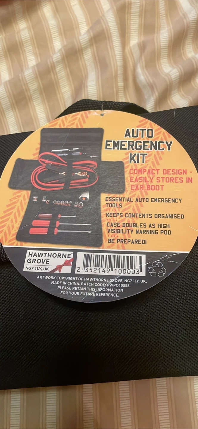 Selling an auto emergency kit with 18 pieces. It features a compact design that easily stores in your car boot. It contains essential auto emergency tools and keeps contents organized. Includes booster cables, flashlight and battery tester