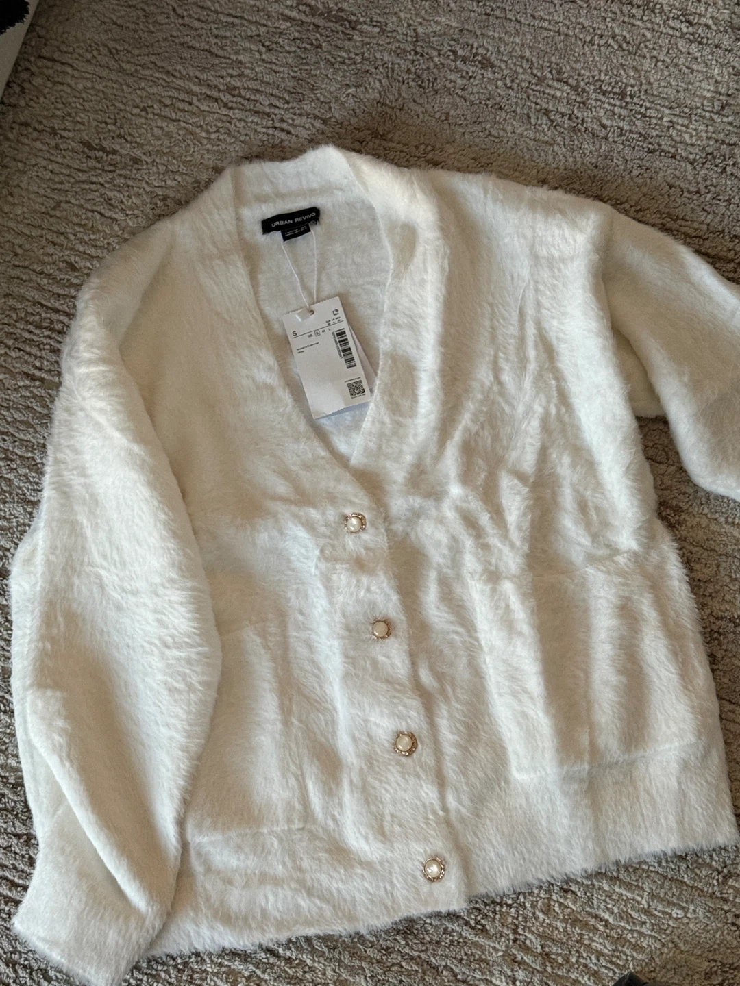 Selling a cozy white cardigan from Urban Revivo! It's a size small and features cute pearl-like buttons. The material is super soft and fluffy, perfect for layering on chilly days