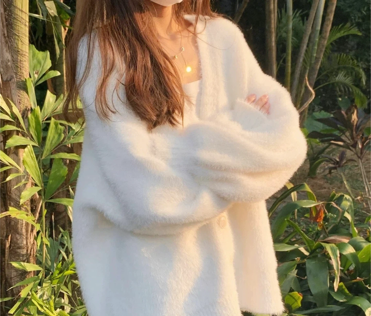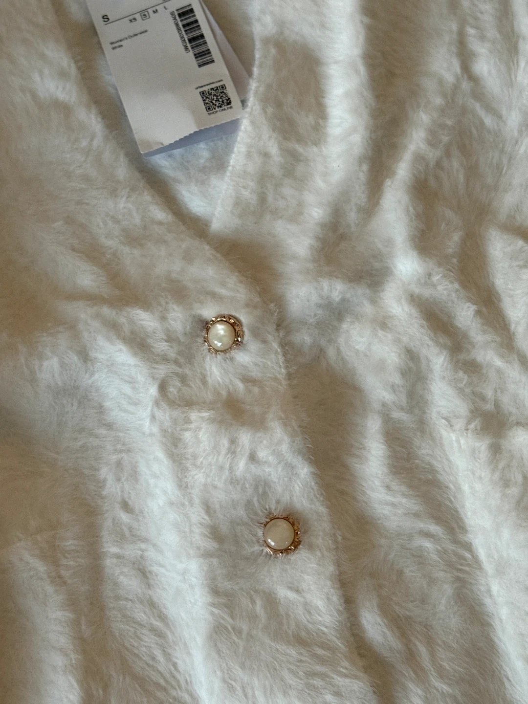 Selling a cozy white cardigan from Urban Revivo! It's a size small and features cute pearl-like buttons. The material is super soft and fluffy, perfect for layering on chilly days
