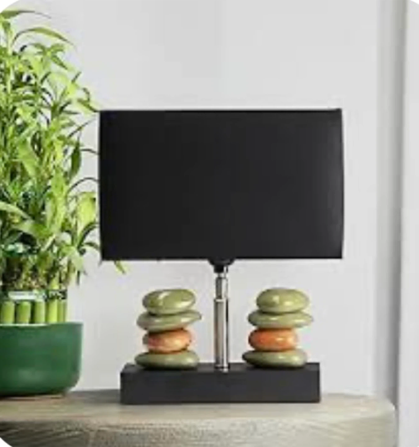 Here's a unique stacked stone table lamp that adds a touch of zen to any room! It features a black rectangular base with two stacks of smooth, rounded stones in shades of green and brown. The lamp is topped with a rectangular shade that diffuses the light beautifully, creating a warm and inviting atmosphere. 14 inches.