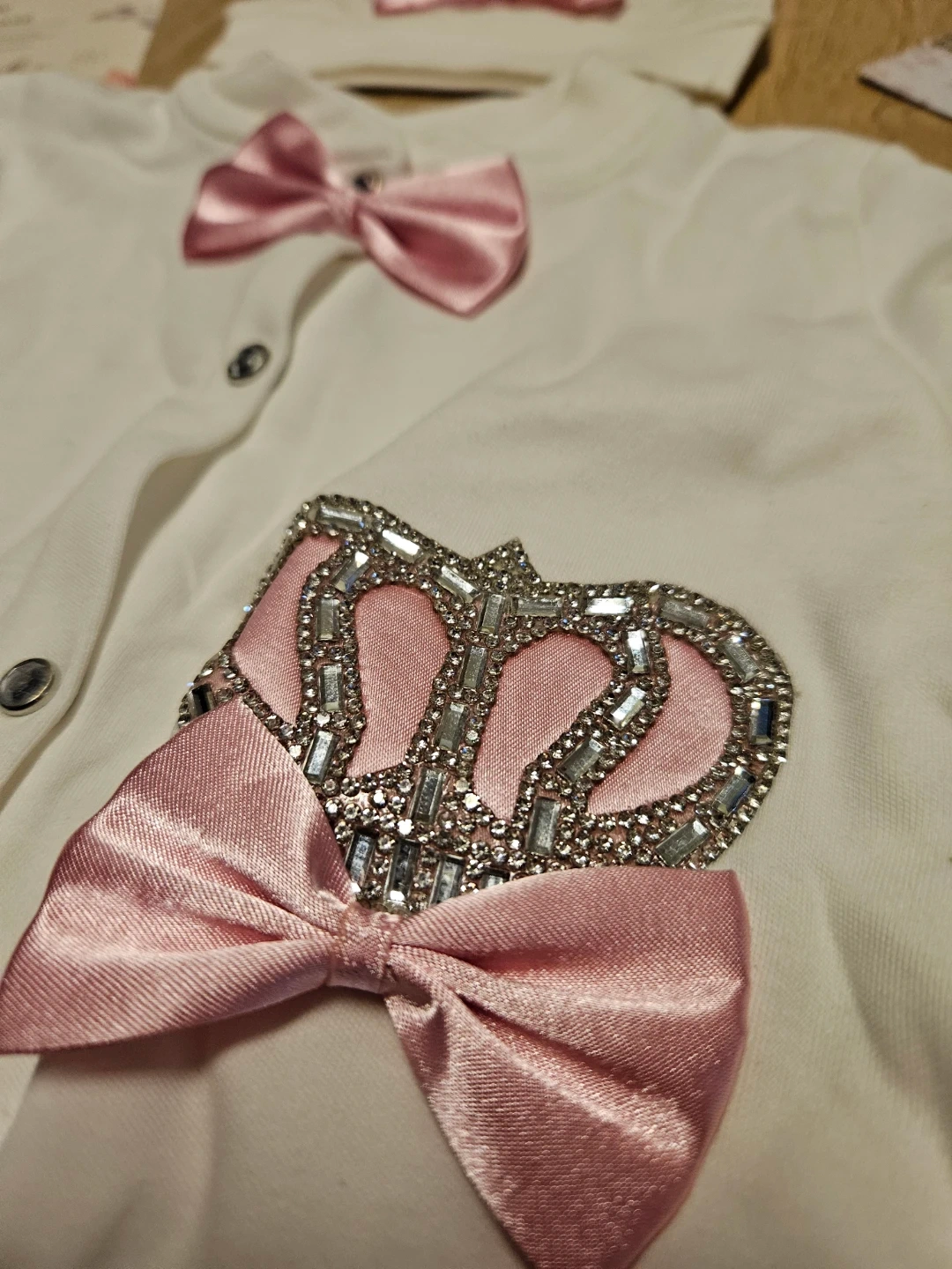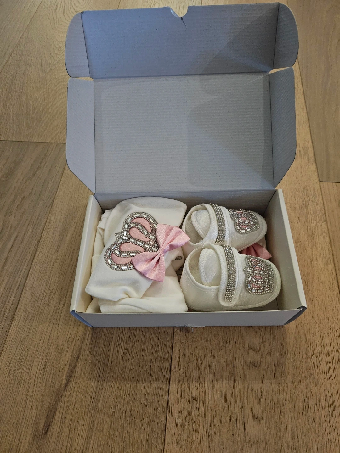 This adorable Lilax baby outfit set is brand new and comes in its original box! It includes a onesie, hat, mittens, and booties, all in a lovely white colour with cute pink bow details and jeweled crown design. Crafted from 100% soft cotton, it's perfect for special occasions. It was never used as my baby outgrew it too fast. Perfect for a newborn gift or Christmas!