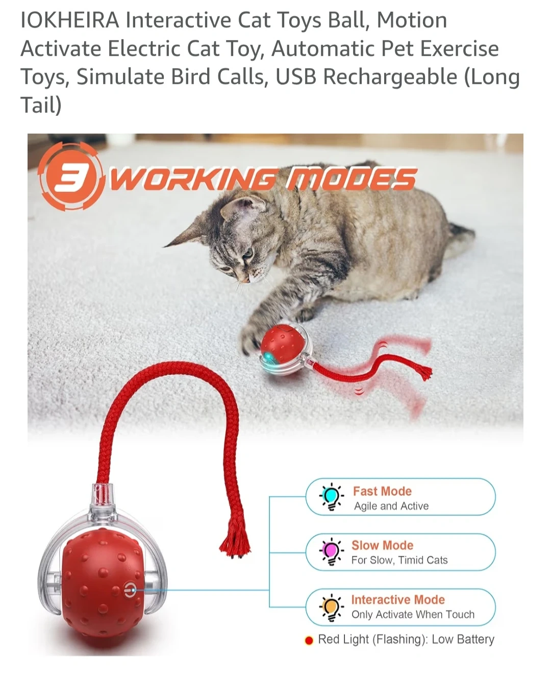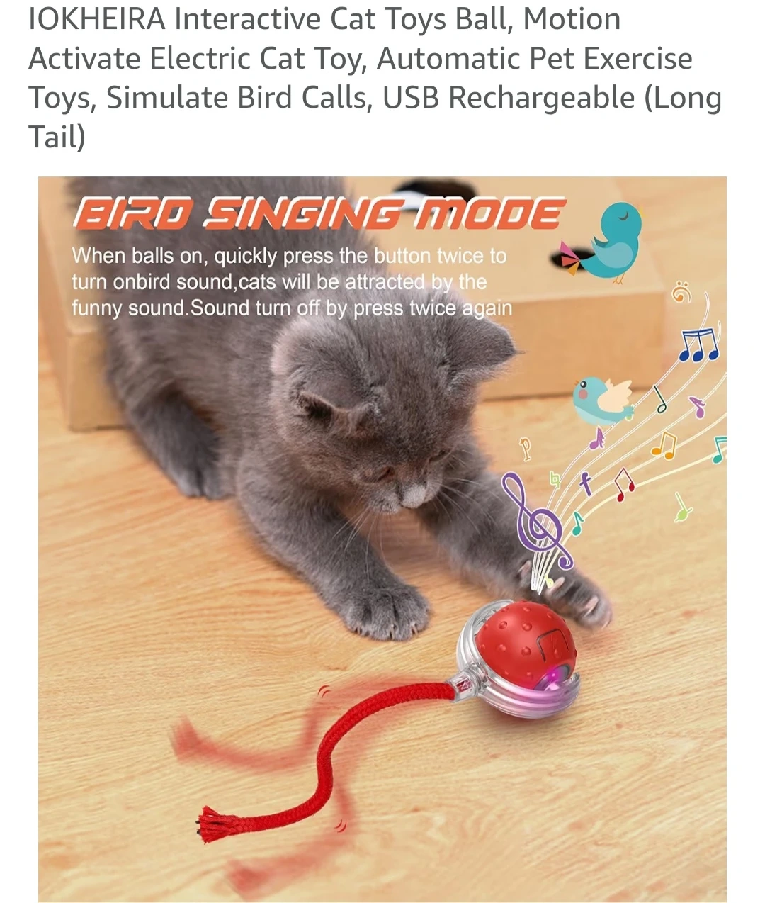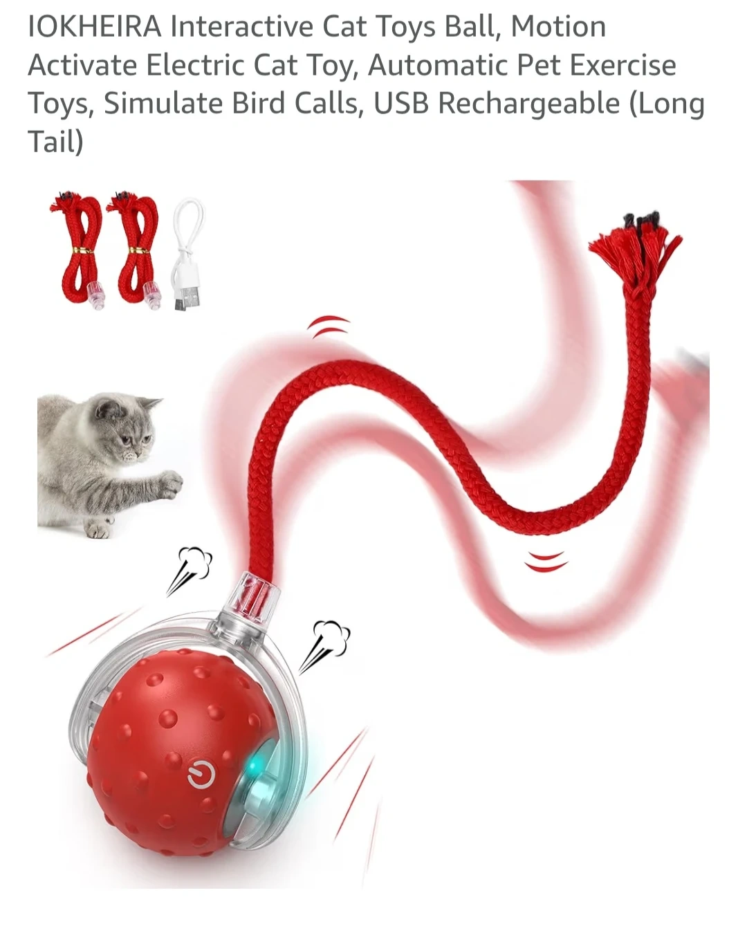 Interactive Cat Toys Ball, Motion Activate Electric Cat Toy, Automatic Pet Exercise Toys, Simulate Bird Calls, USB Rechargeable (Long Tail)