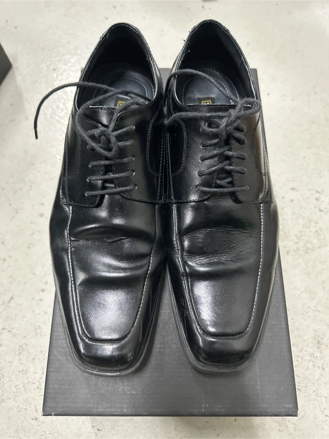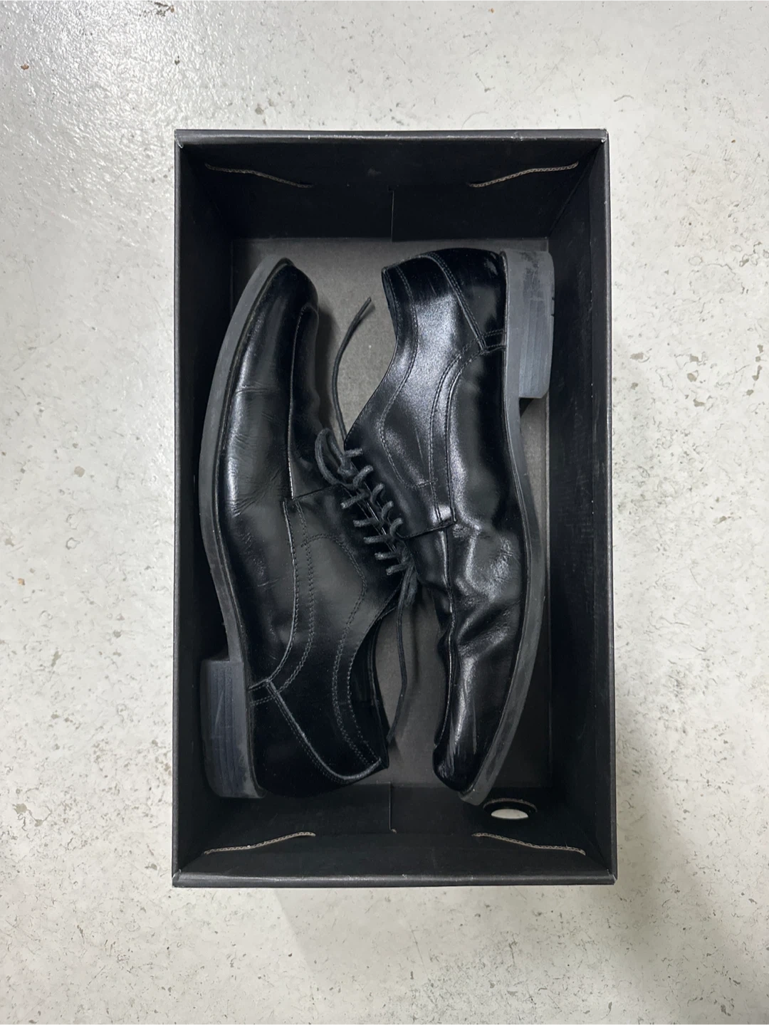 Selling a pair of black dress shoes in size 10.5. They come with their original box. Please take a look at the pictures to see the condition!