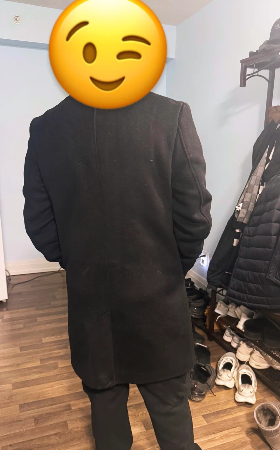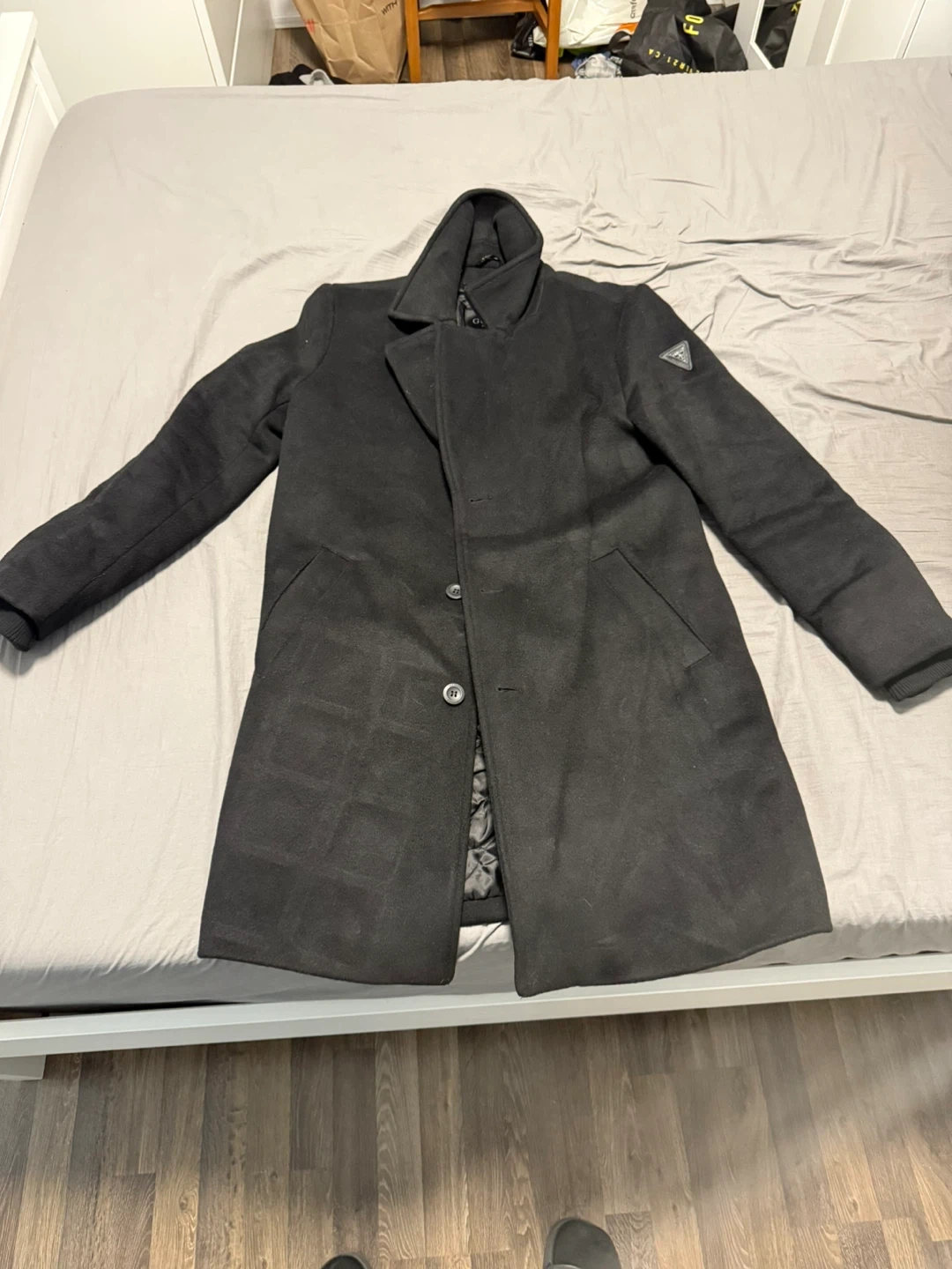 Selling a Guess black wool blend coat. It's in great condition and ready for a new owner! Perfect for staying warm and stylish this winter. The coat features a classic design with a button closure and a sleek, modern look.