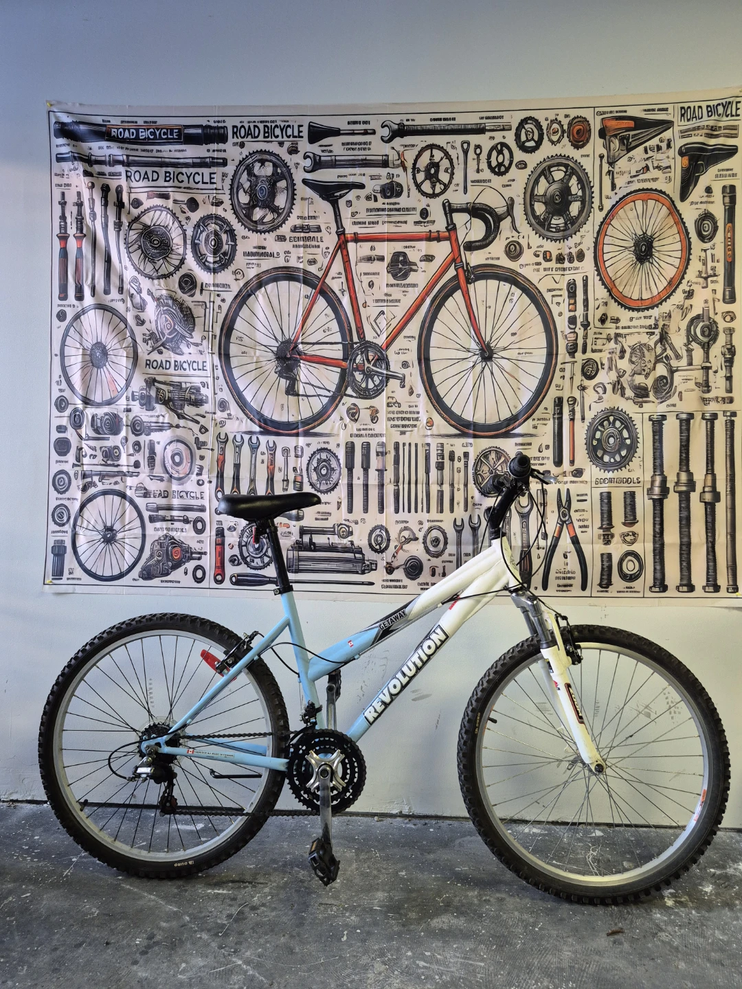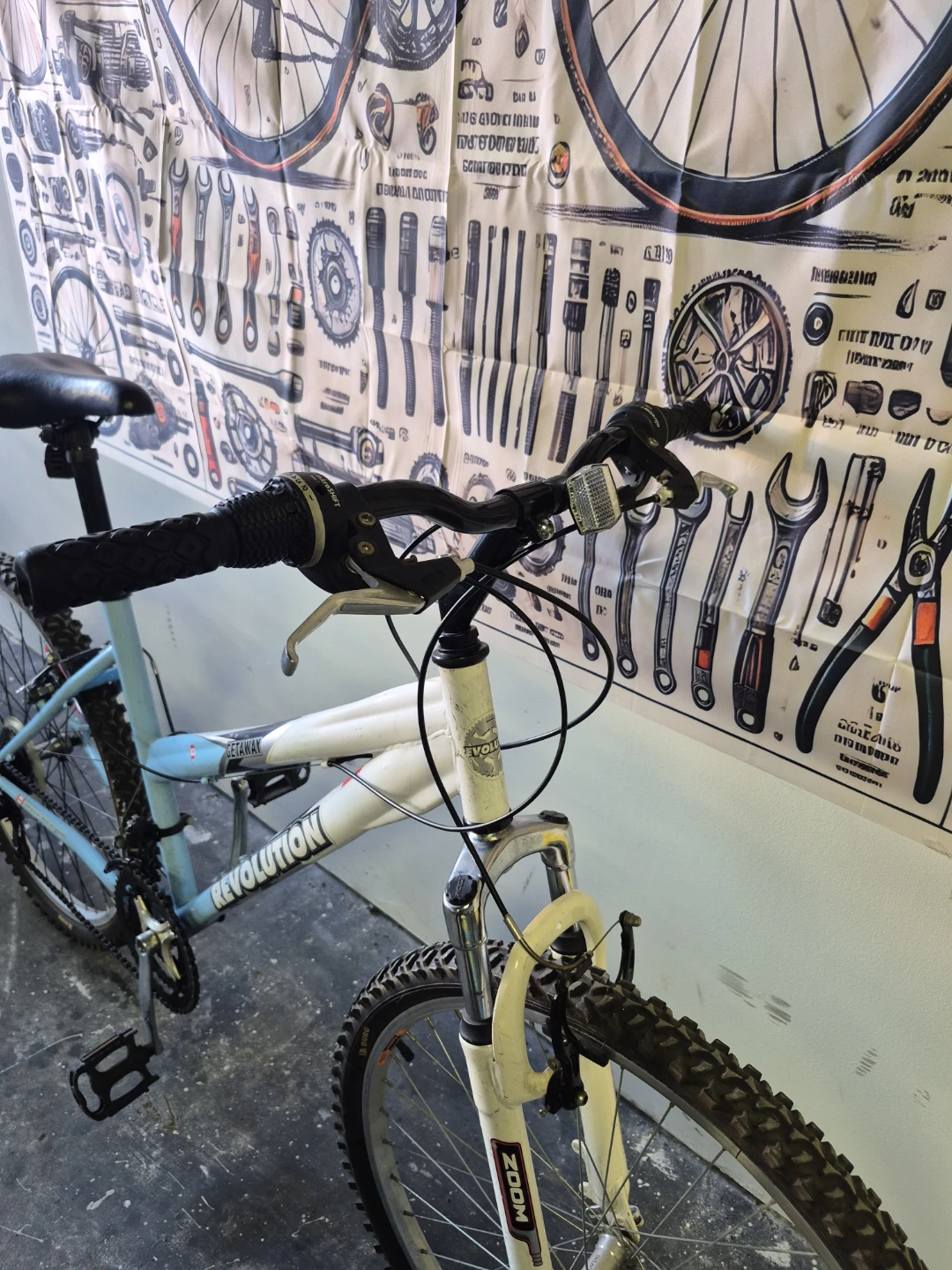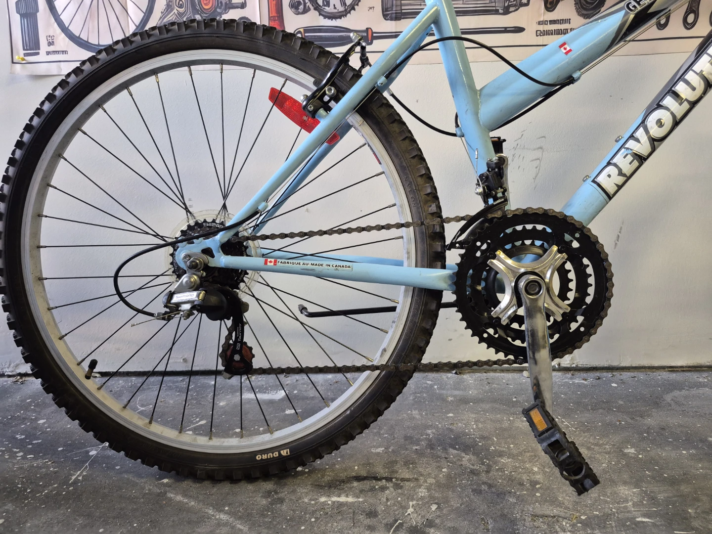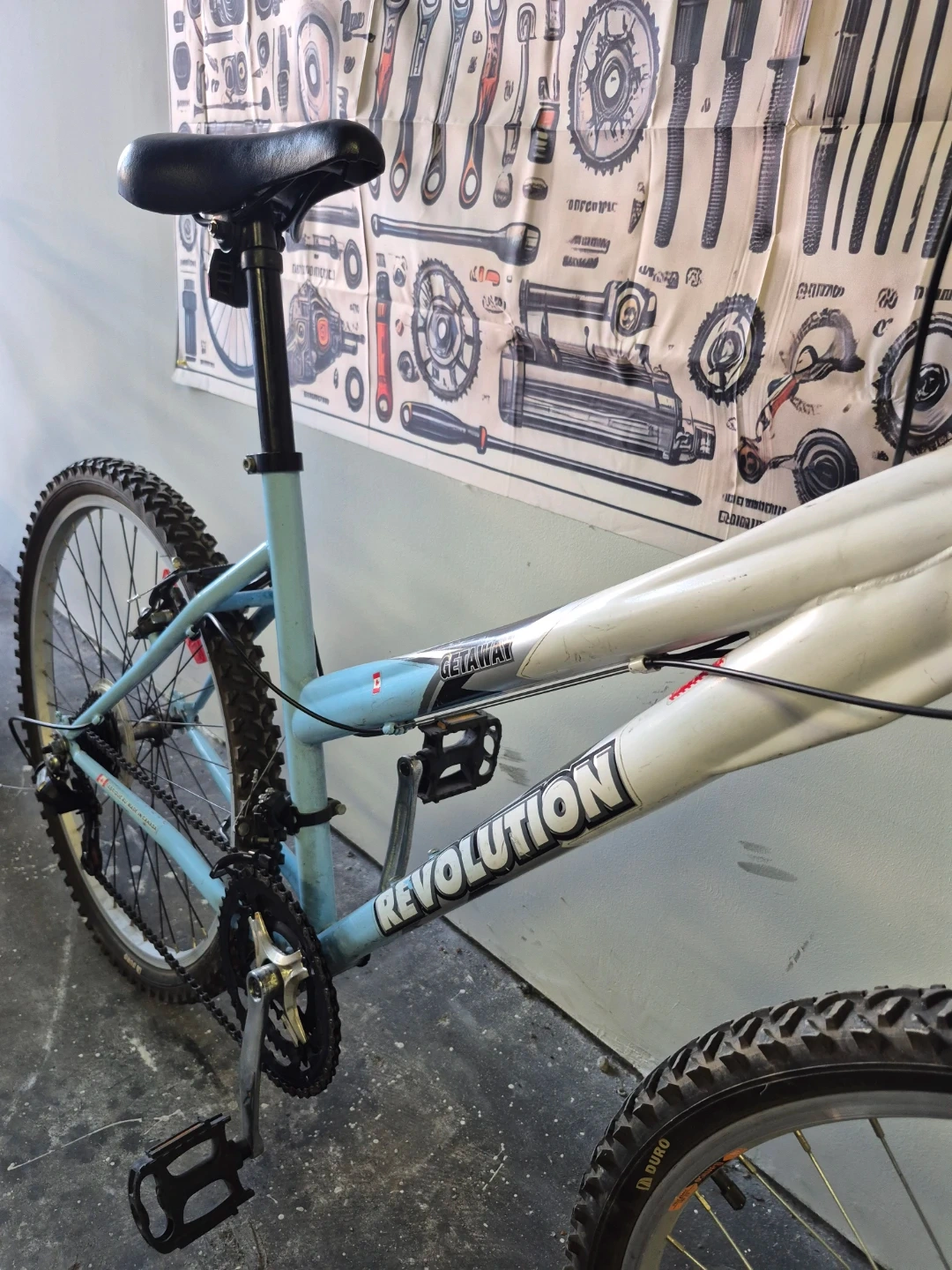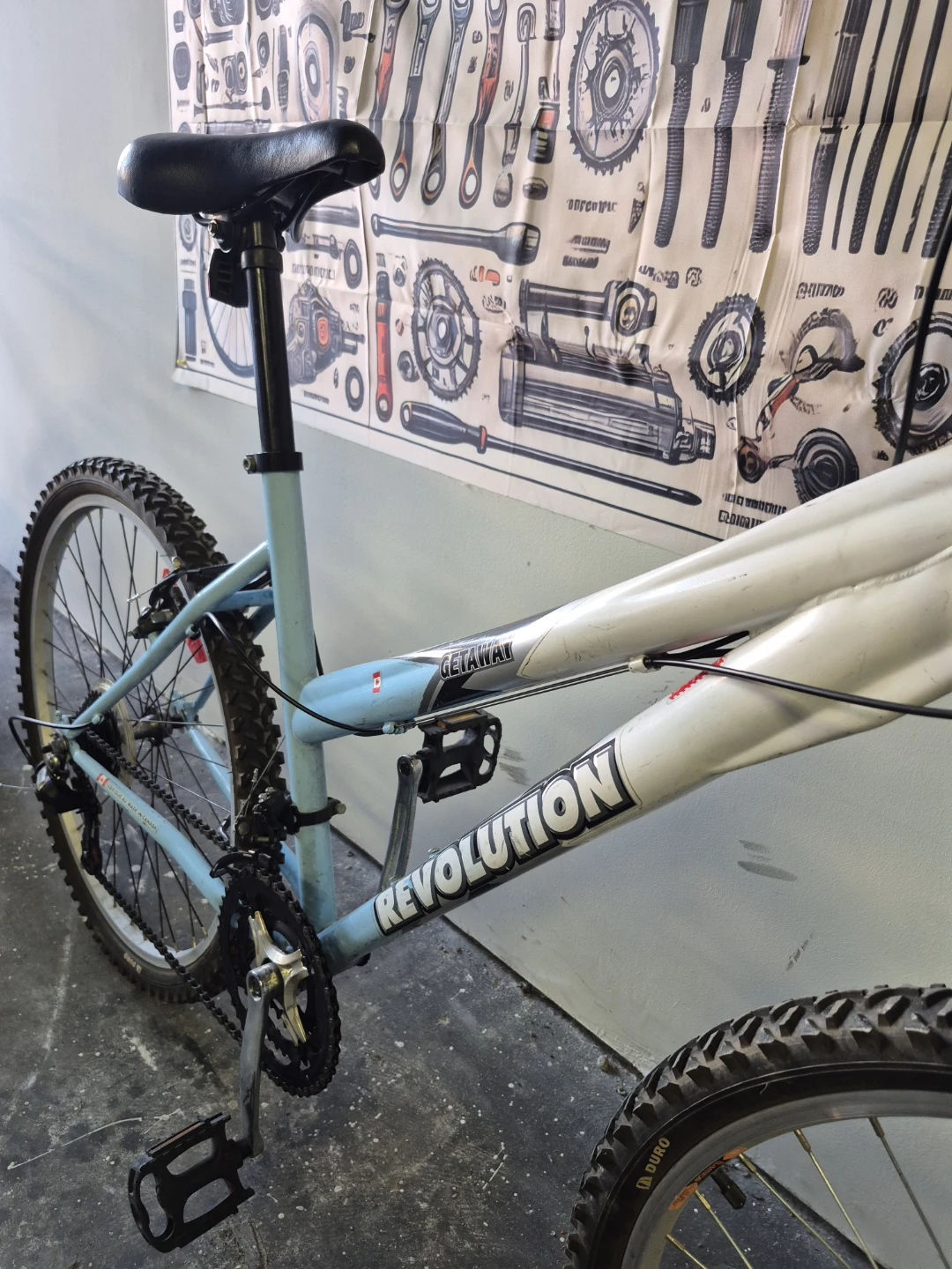 Selling a Revolution Getaway mountain bike in a nice light blue and white colour scheme. It's in good used condition and ready for some trails or city riding! Made in Canada.