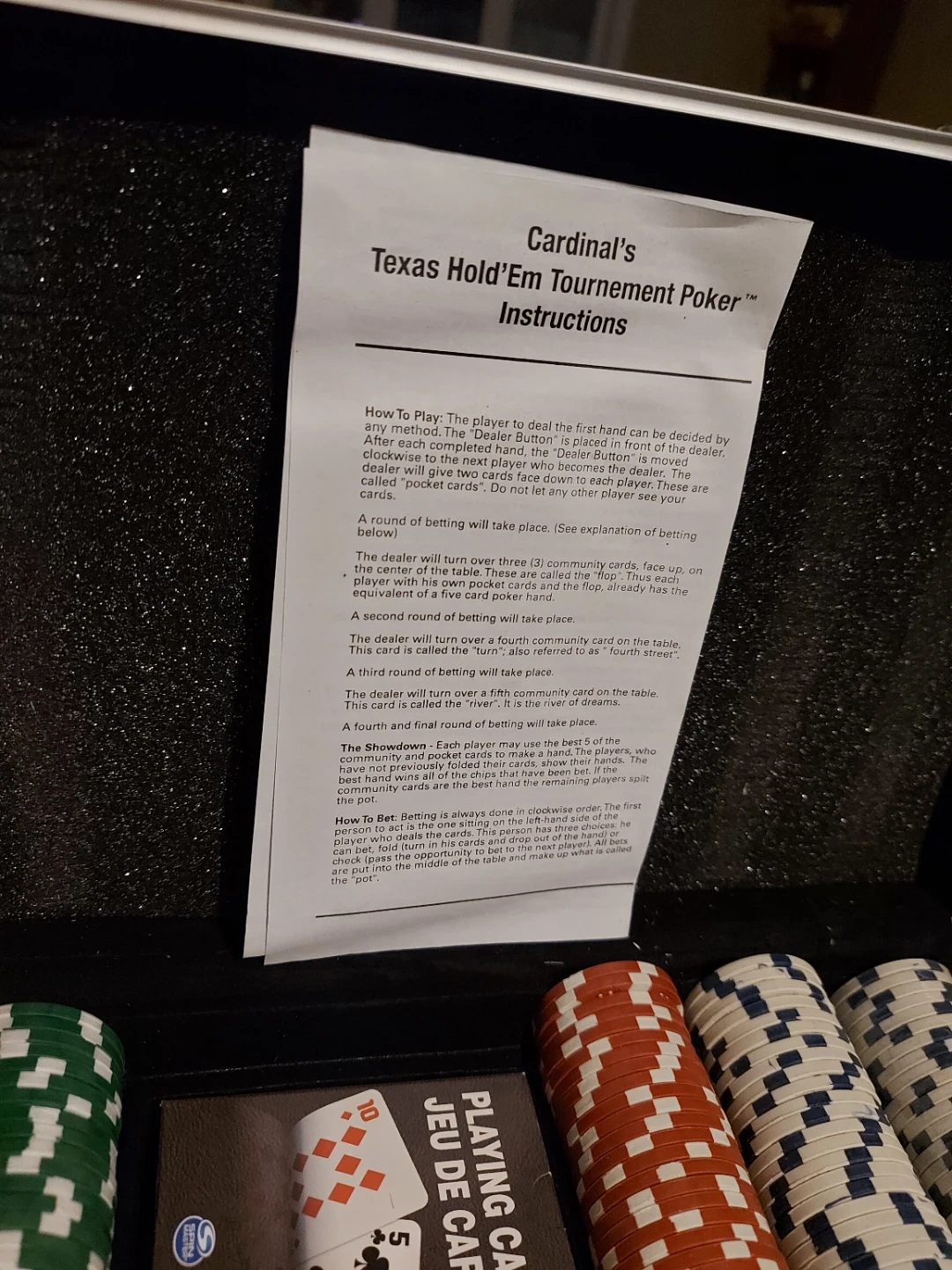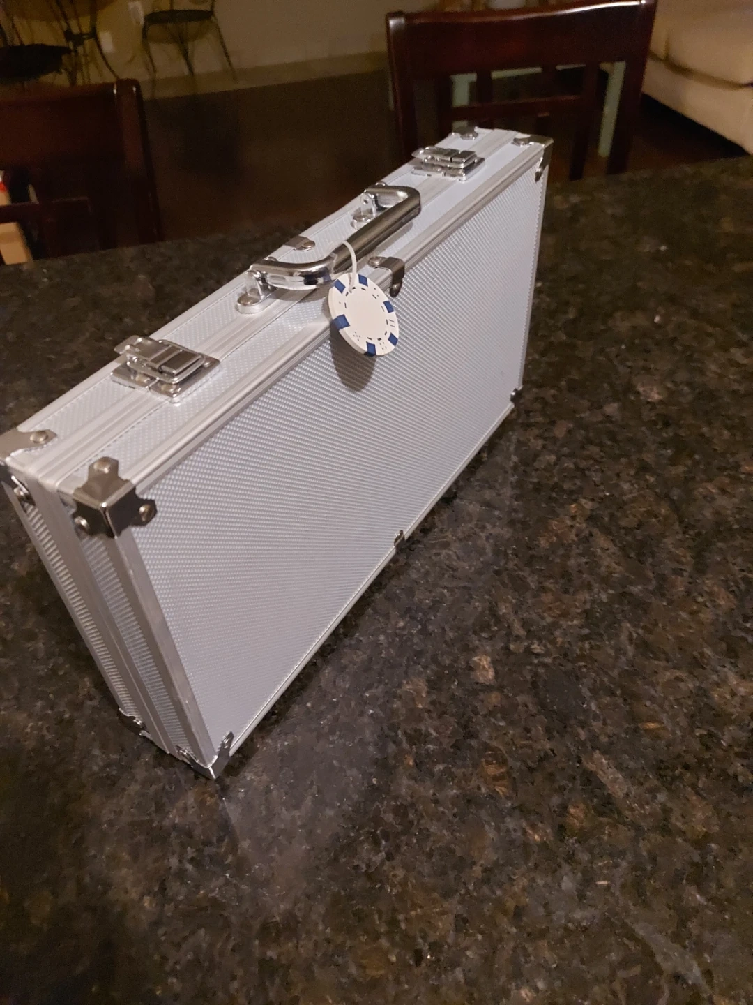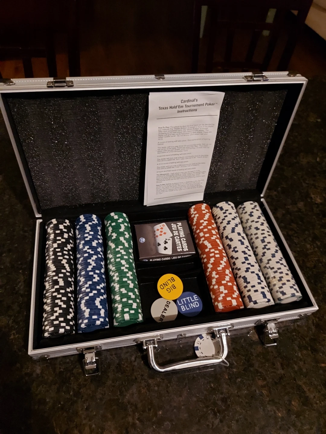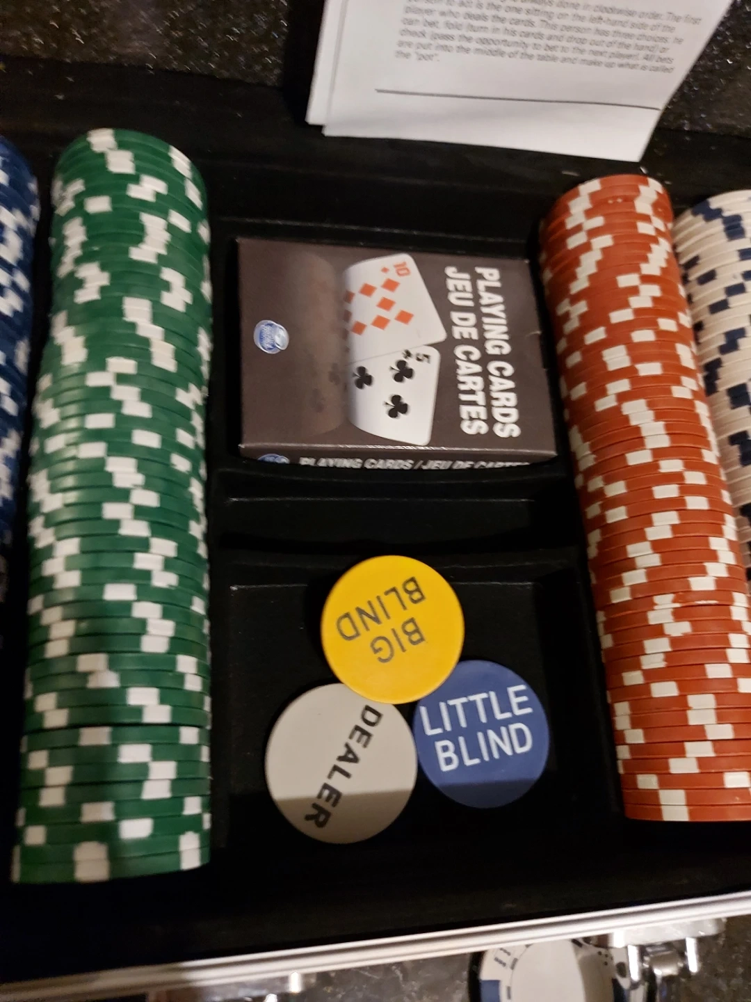 Selling a Poker set. It comes in a silver aluminum case and includes the instructions, playing cards, dealer button, big blind button, little blind button, and poker chips in various colours