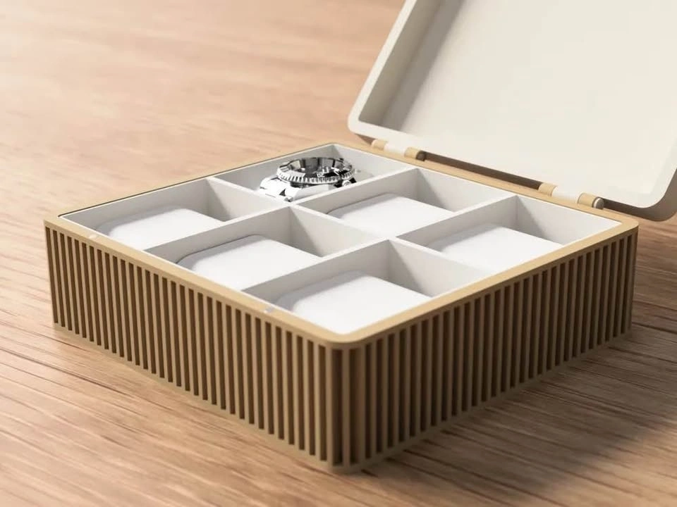 Modern jewelry/tea/watch box. You can add corresponding inserts to configure the box as a jewelry/watch storage, or tea box. The box is 208 mm wide, 194 mm deep and 75 mm tall.