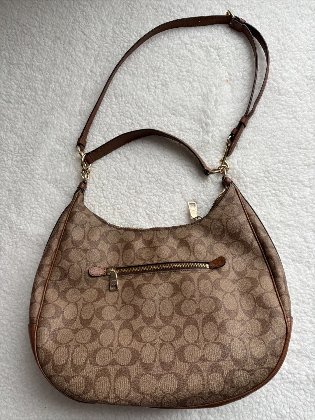 Coach Harley Hobo bag in signature canvas with leather trim and gold-tone hardware in excellent condition.