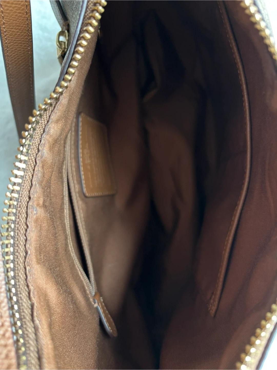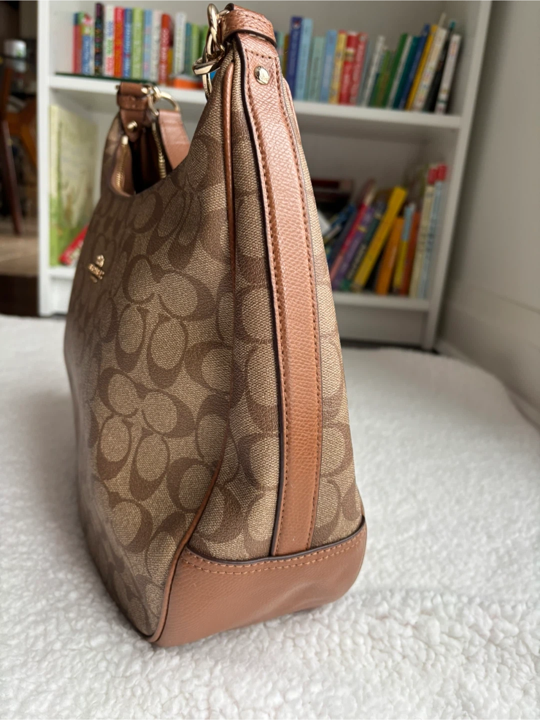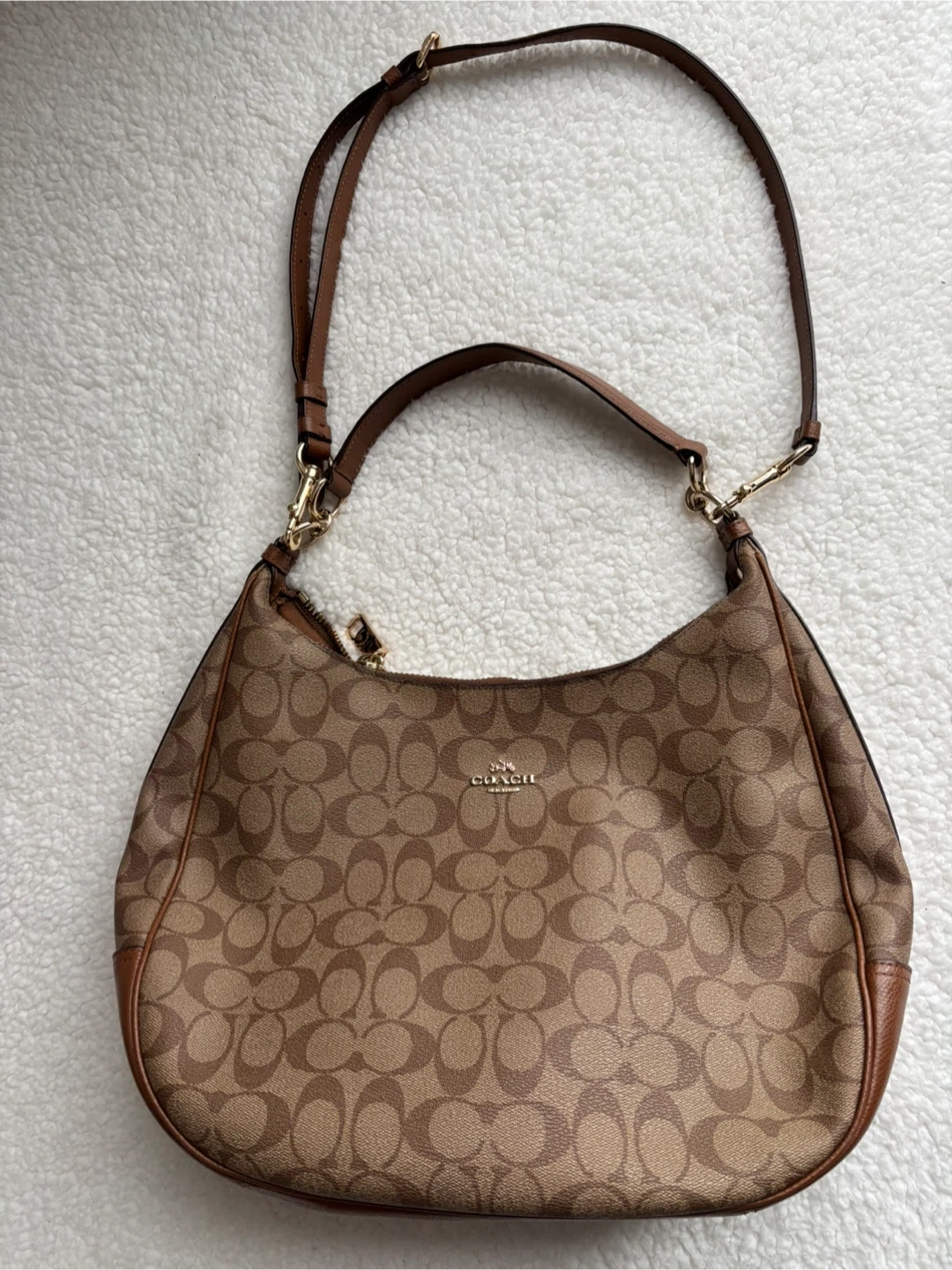 Coach Harley Hobo bag in signature canvas with leather trim and gold-tone hardware in excellent condition.