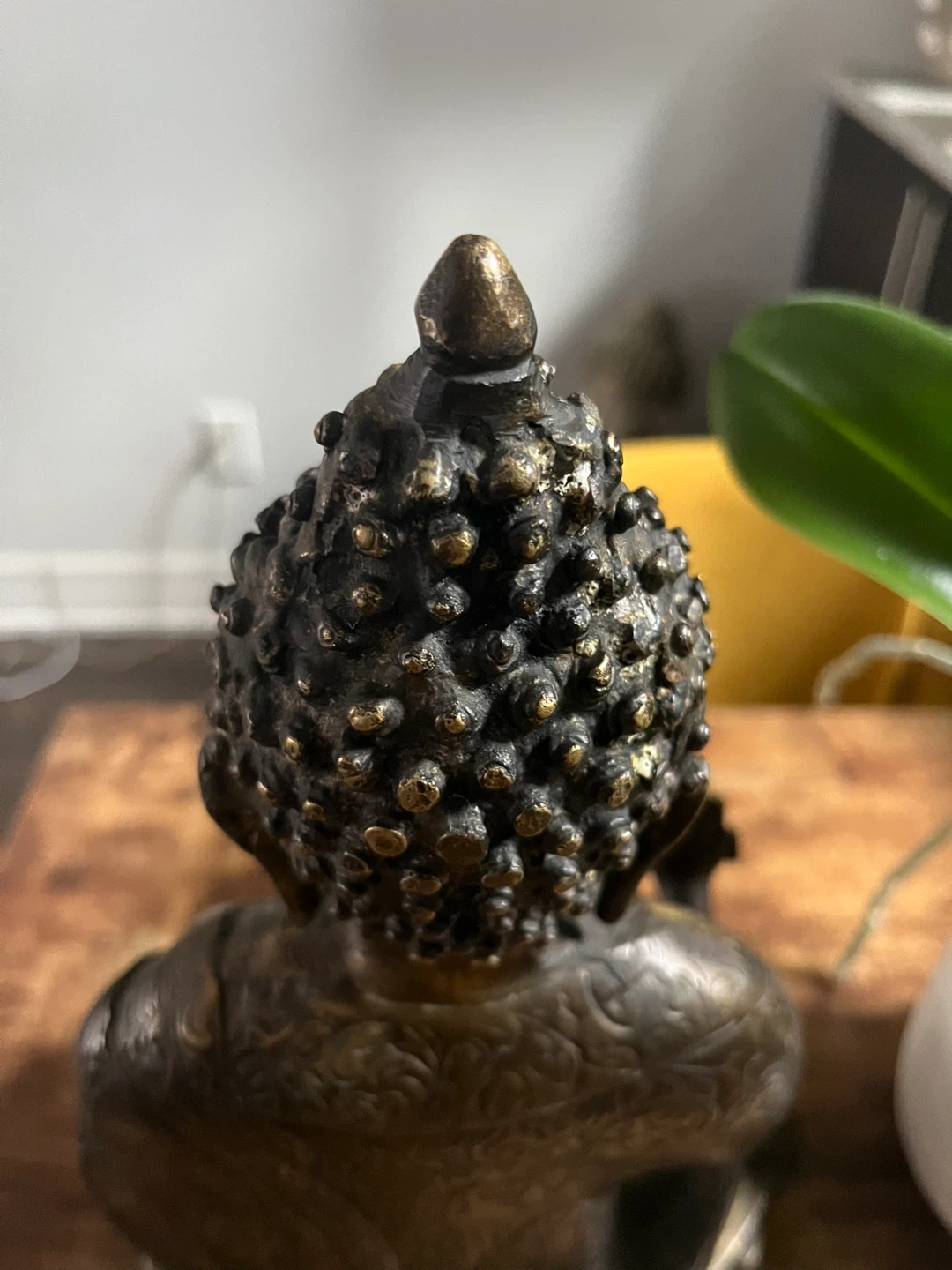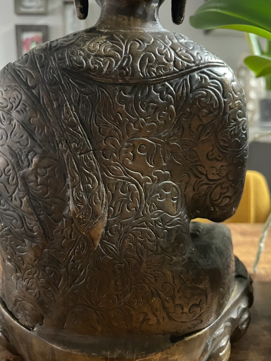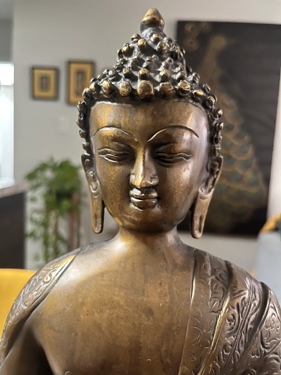 A lovely bronze Buddha statue that would look great in any home or meditation space. It has a beautiful, intricate design and a nice weight to it. It's in excellent condition!